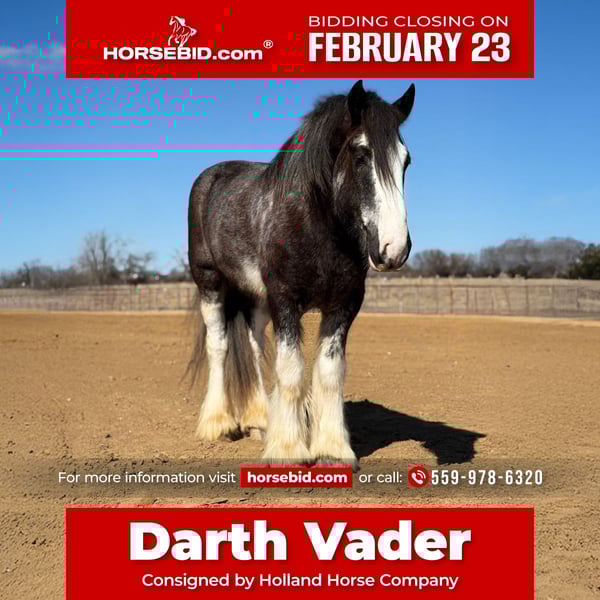 💎 𝐓𝐇𝐄 𝓓𝓲𝓪𝓶𝓸𝓷𝓭 𝐒𝐇𝐎𝐖𝐂𝐀𝐒𝐄 💎 Happening now thru MONDAY | FEBRUARY 23rd - Available EXCLUSIVELY on HorseBid's website! For more details and to register visit: www.Horsebid.com CONSIGNOR CONTACT: Holland Horse Company 559-978-6320 LOCATION: Weatherford, TX BREED: Drum REGISTERED: Yes REGISTERED NAME: Feather Dray's Darth Vader COLOR: Black Sabino HEIGHT: 18 AGE: 6 GENDER: Gelding Feather Dray’s Darth Vader is a 2020 Black Sabino IDHA (Drum) gelding standing a bold 18 hands tall. To know him truly is to love him. We have been incredibly honored to own this special boy and are excited to offer him to his next home. Darth Vader is a true all-around gelding who goes comfortably under both English and Western tack and drives both single and double. He is started over fences and can absolutely fly over them, paired with a beautiful, level headset and exceptional transitions. He rides in the lightest of bridles, remaining soft, supple, and responsive. He will lope off with a simple kiss, stop with a quiet “whoa,” and offers lovely lateral movement with minimal pressure. Out on the trails, Darth Vader is exceptional—sure-footed, confident, and well-behaved both alone and in company. He has the endurance to go all day and absolutely loves the water, happily spending hours splashing if allowed. Under Western tack, he has a solid neck rein, packs a bridle with ease, and shows beautiful circles and an excellent stop. He is incredibly handy for his size—able to open and shut gates, drag objects, and work with the agility and feel of a much smaller horse. We cannot say enough about how light and athletic he feels under saddle. In the barn, Darth Vader is as friendly and “in-your-pocket” as they come. He adores attention and will seek it out, has excellent ground manners, and is a true gentleman for the farrier. He is playful with his pasture mates and handles time off without any issues. He is the type you can saddle up and ride immediately—or hop on bareback and cruise if you prefer. Darth Vader approaches new experiences with curiosity and confidence, taking everything in stride. He is UTD on everything, 100% sound, and ready to find his forever home. For more information, please feel free to reach out with any questions to Chanel with Holland Horse Company at 559-978-6320.