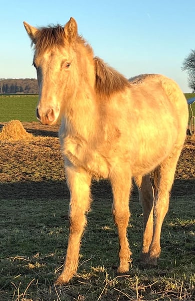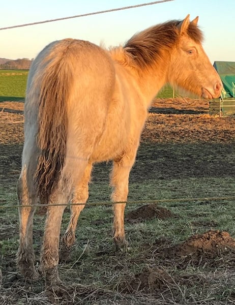 Beautiful golden colored mare from 21.07.24. She grows up robust in the mare herd. She is people-oriented and respectful in daily handling. Her fast and well-balanced movements make her the perfect all-rounder. She knows cars, tractors, children, cyclists, cows and much more. If you are looking for a robust, compact horse, then she is the one for you. Her dam is a Spanish mustang mare x Sorraia. Her sire is a compact, friendly Quarterhorse stallion Worth a look. Everything else on the phone. If you are looking for something special, then this is the one