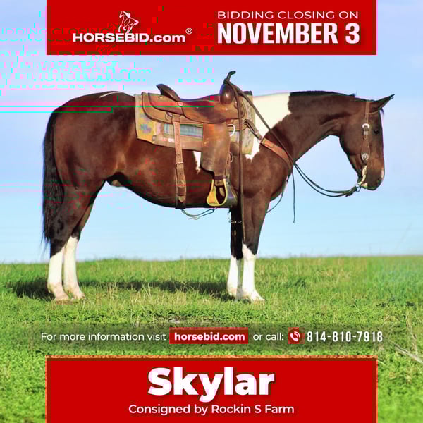 ⚜️𝐓𝐇𝐄 𝐅𝐀𝐋𝐋 𝐇𝐄𝐑𝐈𝐓𝐀𝐆𝐄 𝐂𝐋𝐀𝐒𝐒𝐈𝐂⚜️ Happening now thru MONDAY | NOVEMBER 3rd - Available EXCLUSIVELY on HorseBid's website! For more details and to register visit: www.Horsebid.com CONSIGNOR CONTACT: Rockin S Farm 814-810-7918 LOCATION: Rebersburg, PA BREED: Paint quarter horse REGISTERED: Yes REGISTERED NAME: I'm Freckles Gino COLOR: Paint HEIGHT: 14.2 AGE: 9 GENDER: Gelding 🔥🔥 Skylar 🔥🔥 Here's a super cool dude! Skylar is a 2016 registered Paint Horse gelding. He is 9 years old and stands 14.2 hands tall. He is built like a tank. Gorgeous tobiano color and classic foundation looking build. Not only is he well built but also very well bred and sired by Smart Little Freckles which is a grandson of Smart Little Lena! He definitely has the pedigree to excel in various disciplines and has been hauled to the fun shows He has extensive experience doing ranch work including checking fence, carrying gear and tools, finding lost stock on 300 acres, moving stock etc. He also has extensive experience on all types of trails. He can handle very tough and technical trails with rocky terrain, steep climbs and deep ditches. He will cross water and obstacles. He is slow and steady on rough terrain and will pick his way along. He has also been hauled to shows and to state parks on trail rides which he handles like a champ, new areas do not phase him and he always takes care of his rider he works great in the arena and knows his leads , he's got all the fancy buttons yet he is uncomplicated for beginners to ride, He neck reins and side passes and will also ride bridless, he has a soft jog and a smooth lope. he will ride alone to work or pleasure ride. He has a laid back, friendly personality. He is accustomed to country traffic and busy roads. He is athletic and talented. He could excel in any western discipline or competition. He is sound and healthy. He easily loads and hauls. He has great ground manners, standing tied, bathing, trimming etc. He gets along fine with other horses under saddle and in the pasture. Skylar is ready for his new forever home and is up-to-date on farrier and dental as well as a current Coggins and health certificate If You have any questions please feel free to call Sam 814-810-7918