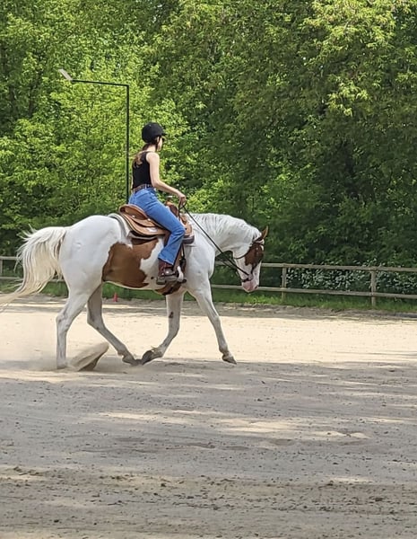 Ich gebe meinen hübschen Paint-Wallach ab. Er ist gut ernährt und ein angenehm feinfühliges Reitpferd für Pferdemenschen die Herausforderungen mit ihrem Vertrauenspferd gemeinsam meistern wollen. Er ist 10 Jahre alt, schmiedefrom - vorne beschlagen Ausbildung: Western-Freizeit, Bosal gewöhnt. Ausreiten und spazieren geht trotz leichter Schreckhaftigkeit alleine und mit anderen Pferden. Allgemein ist er tipptopp gesund, jedoch PSSM positiv. Mit entsprechendem Futter und regelmäßiger Bewegung händelbar! Grasen geht nur eingeschränkt. Er ist Offenstallhaltung gewöhnt und ein faires ranghohes Pferd. Er wünscht sich viel Sicherheit und belohnt einen mit Zutrauen und Vertrauen. Aufgrund eines Schicksalsschlages bin ich leider gezwungen meinen Liebling abzugeben. Inkl. Kompletter Ausrüstung! Weiteres gerne privat. Ich freue mich über ein Kennenlernen.