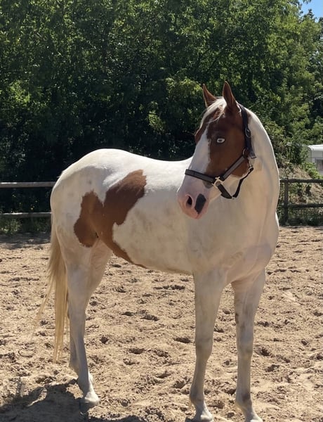 I am offering my beautiful Paint gelding for sale. He is well-fed and a pleasantly sensitive riding horse for horse enthusiasts who want to face challenges together with their trustful partner. He is 10 years old, shod in front, and has a good conformation. Training: Western leisure, accustomed to Bosal. He is comfortable riding out and walking alone or with other horses, despite slight skittishness. Overall, he is in excellent health but tests positive for PSSM. With appropriate feed and regular exercise, he is manageable! Grazing is limited. He is used to herd life in an open stable and is a fair, dominant horse. He seeks security and rewards trust with confidence and loyalty. Due to a personal tragedy, I am unfortunately forced to part with my beloved companion. Including complete equipment! Feel free to contact me privately for more details. I look forward to getting to know you.
