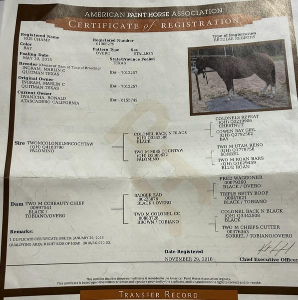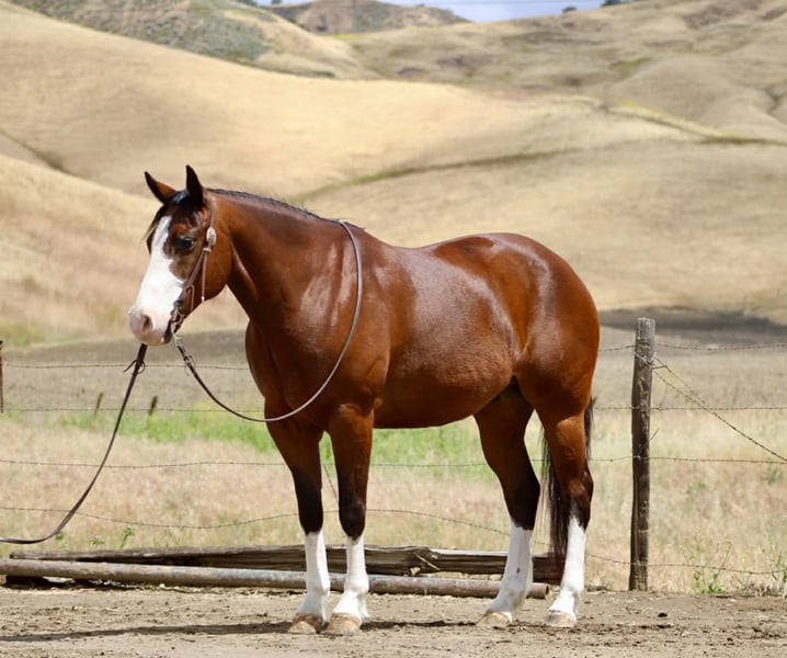 "AVAILABLE ON ONLINE HORSE AUCTION AT www DOT PlatinumEquineAuction DOT com BIDDING OPEN NOW thru SUNDAY | MAY 10TH! *Final price will be determined on auction site* CONSIGNOR CONTACT INFO: Longhorn Ranch 831-537-1915 LOCATION: Paicines, CA Champ “Built to handle the world—and look good doing it.” RGS Champ is a 2015 APHA bay overo gelding that brings together presence, mind, and usability in a way that’s hard to come by. He’s built with balance and substance, the kind that looks right from every angle. That rich bay color paired with his overo pattern gives him a sharp, eye-catching look. Champ has a natural confidence about him. He’s quiet, aware, and tuned into what’s around him without being reactive. He’s the kind that thinks first, stays honest, and keeps his rider in a good spot. From the ground up, he’s the kind that makes ownership easy. He stands tied like he’s got nowhere else to be, saddles up quiet, and handles hauling, bathing, farrier, and vet work without any fuss. He settles into a stall or pasture the same way—no pacing, no nonsense—just a gelding that fits in and goes about things right. Under saddle, Champ rides the way a broke horse should. He’s smooth, balanced, and comfortable, with a soft feel in the bridle and a willing attitude. He moves out with a steady, natural stride, picks up both leads clean, and carries himself level without needing to be held together. His stop is correct, his turnaround is clean, and he backs with ease. Nothing forced, nothing overdone—just a solid foundation that’s been put there the right way. He’s the kind you can ride every day and appreciate, or pull out after time off and go right back to work without having to tune on him. Where Champ really stands out is how he handles the world outside the arena. He’s been ridden down busy streets and around traffic, including cars and everyday commotion, and stays steady and confident. He doesn’t get overwhelmed or look for trouble—he stays focused and goes on with his job. Out on the trail, he’s proven and reliable. Hills, rocks, brush, and rough terrain are all part of his routine. He travels out with purpose, stays sure-footed, and keeps his rider in a good position from start to finish. Ride him alone, in a group, leading or following—he stays consistent and dependable. We’ve also taken the time to introduce Champ to obstacles, and he handled it all with great composure. Tarps, flags, and other distractions are met with a willing, thinking attitude. He takes a look, processes it, and moves forward without overreacting. On top of that, he’s been used to gather cattle and understands having a job. He’s comfortable moving livestock and working in an open setting, adding to his versatility and making him a horse you can put to use when needed—not just one to ride around. Backing all of this is breeding that includes Colonel Back N Black and strong Two Eyed Red Buck influence—lines known for producing horses with ability, versatility, and good minds. Champ reflects that in the way he carries himself and handles every situation he’s put in. He’s not a horse that needs explaining. He’s the kind you step on and understand right away. Solid. Honest. Dependable—with just enough presence to make you proud to own him. Come meet him in person or reach out to set up a video chat—we’re happy to show him to you. Nationwide shipping available with reputable haulers. Dina at Longhorn Ranch Paicines, CA 831-537-1915