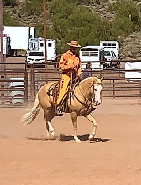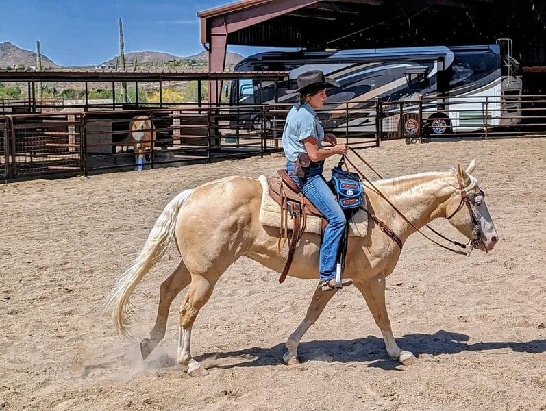 ⚜ The HERITAGE Classic ⚜ Happening now thru MONDAY | AUGUST 11th - Available EXCLUSIVELY on HorseBid's website! For more details and to register visit: www.Horsebid.com CONSIGNOR CONTACT: MTM Ranch 480 488 4538 LOCATION: Cave Creek, AZ BREED: APHA. REGISTERED: Yes REGISTERED NAME: Pistol Packing Dude COLOR: Palomino HEIGHT: 15.1 AGE: 11 GENDER: Gelding “Pistol Packing Dude” is a perfect prime age gelding with that stunning “iridescent” chrome gene Palomino color. His rare color is all set off with a thick beautiful creamy mane and tail that we have to trim 2 inches a month to keep off the ground. Pistol is flawless without a splint, bump or lump. He has Career earnings of over $30,000, gladly carrying dudes in his four, five and six year old year for us. The last four years he as only been Guided on. Extensive training in the arena started in his 6 year old year. He had never really even loped or stopped hard before that so chances of bad hocks and all those early hard use problems that come later in a horses life are not likely to show up. He was left to mature properly and was professionally started. Soft in the face with the snaffle, cow horse or full spade bit. Pistol lopes perfect soft slow circles and high speed big circles. He is a finished bridle horse. Check out his ranch riding video in its entirety as he never missed a beat. It won’t take a minute for you to pick us out of that crowd. That was only the second show. He did win. At his first show he placed first in confirmation under all three judges. As would be expected with his world champion double Skipper W pedigree. Let's not take for granted the dams side of Docs Prescription X DocOlena breeding. He cows up really hard. Possibly more than a beginner is ready for. He has been sorted on and was progressing really well. He really reads and tracks a cow naturally but aggressively. He did have three months of professional rope horse training with Jake Scott out of Wickenburg three years ago. I broke my right hand just when he was finished there and I have never roped on him since. He would require a tune up with a professional but he was very fast out-of-the-box as you will see in the videos. That's Jake Scott on the head and Chantz Stewart on the heels . We did shoot guns off him to check his ability and willingness. I am a former champion mounted shooter and he was fine, but I am professional. He was exposed to this three times but he could be finished out as the shooting horse. We did dabble around in working equitation he did fantastic every obstacle and it was exceptional with the garrocha so please check out our video as such. Long lines very well. He has been ridden English and never missed a lick, so that is not a problem if someone wants to do all around. He has been in three national commercials and pro advertising photo shoots. He's great with shiny boards and cameras. He is super willing and lives for attention . I would wish him to go to a busy “ride him every day home”. He has been with me since he was two years old and has had a four to six hour a day job every day since I started him. These busy using horses aren't meant to be ridden once or twice or three days a week. They're meant for daily job. If you don't keep them busy it is not fair and that is what makes him happy. He's a willing partner that will meet you at the gate kind of guy with 0 bad habits. He's literally been hauled thousands of miles to any place we chose to ride, he went willingly. He rides, slides and turns around in little circles and has great changes. Naturally of course he bends and flexes and side passes and that's why he has nice lead changes. It is unfortunate I had three bad bouts of COVID which have limited my agility and desire to keep on showing him. It is my greatest wish that he goes on and does great things with a good rider and willing partner. He of course is registered with the APHA but could double at AQHA shows he's obviously eligible for the Pinto PTHA World show and even could be registered as Palomino PBHA for which his father and grandfather were world champions Pistol is located in Cave Creek AZ and you are more than welcome come and try before you buy. We have some beautiful country. Please feel free to contact me at 480-488-4538. Pre purchase exams welcomed.