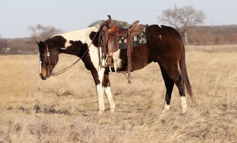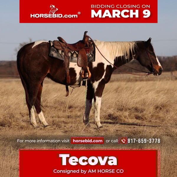 ℳ𝒶𝓇𝒸𝒽 ♦️𝐑𝐈𝐃𝐄𝐑'𝐒 𝐂𝐇𝐎𝐈𝐂𝐄♦️ Happening now thru MONDAY | MARCH 9th - Available EXCLUSIVELY on HorseBid's website! For more details and to register visit: www.Horsebid.com CONSIGNOR CONTACT: AM HORSE CO 817-659-3778 LOCATION: Mineral Wells, TX BREED: APHA REGISTERED: Yes REGISTERED NAME: MACARIO GOLD COLOR: Bay and white paint HEIGHT: 15.1 AGE: 12 GENDER: Gelding 💛 MACARIO GOLD💛 see if he checks these few boxes for you?⬇️ 🌟An absolutely certified GENTLE, EASY AND BEAUTIFUL for any age ⭐️A horse that is handy enough but calm enough to do any job or anything you ask of him? ⭐️A horse that is perfect for someone wanting to learn or just someone wanting to ride on the weekends? 🌟The perfect gelding to ride down the trails all day long without any trouble whatsoever? ⭐️A great lesson horse? Or Drill team? Maybe a sorter? To go ranch on? Tecova isnt just a cool paint but will have you look for years to find one like this! A great pedigree come with this guy, Corona Cartel, Royal Quick Dash and more all right there on his papers! Tecova is a perfect 12 years old, 15.1 hands tall, and weighs 1200lbs! A good paint horse is hard to come by, don’t miss out on him! He will stand for absolutely anyone to get on, no matter what you’re using to get up there. He is put together correctly and is calm as you could want and a true gentleman and has a patient temperament. He is one of those all around geldings that are forgiving enough for those complete beginner riders but he is also fun for an advanced! You can’t go wrong with him for your family! Tecova is very easy, he walks, trots, lopes and side passes very well! He’s extremely smooth to ride and has a beautiful rocking chair lope each direction! We can’t say enough good things about him, and believe it or not, there is NOT one bad thing we could say. He is the very best first horse and the perfect addition to your family. I could talk about him all day long, or you could come see him for yourself! We are located in ♦️Mineral Wells Texas♦️but have reputable haulers that go all over the country, including Hawaii and Canada. Give me a call or text and I’d be happy to answer any questions! 817-659-3778