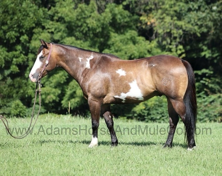 Go to www.AdamsHorseAndMuleCo.com for more pics and a video. AHAMC has been in the horse business and sold horses over the internet since 2005. We have a long track record of success with hundreds of happy customers. We work hard to match riders with the correct horses and specialize in beginner safe, family friendly horses that have been used and checked out by our family! Hercules is a super stout built dark buckskin overo gelding standing around 15.1hh. He is an 11 year old with lots of experience! Hercules has been used around the ranch for sorting and penning cattle. He has been pasture roped off of and doctored sick ones. Hercules is a great horse to rope out of the box on the head side and is one that a novice can take to jackpots and win on. Away from the ranch and ropings, Hercules is an awesome trail horse! He will mosey along slow and easy down the trails and he is a horse that the whole family can ride and one that will build everyones confidence levels! Hercules has been ridden in South Dakota, Oklahoma, Texas and throughout Kentucky. He will cross creeks, ditches, logs and navigate rough rocky areas. He is safe riding in traffic. He has a smooth jog, has a good stop, turns a circle both ways and backs with ease! Hercules has the one of the best lopes that you will ever set on, you just wont find one that is any softer or smoother! Hercules is a confident horse on the trails and will lead the crew, head out alone with no issues! He has been exposed to all kinds of wildlife such as deer or turkey or other animals like cows or dogs and will go anywhere that he is asked too. He has been rode many miles in the mountains of Eastern Kentucky and encountered every obstacle possible on the trail. He will go up or down even the steepest slopes, across deep creeks, over downed trees, and over all types of rough terrain while still being sure footed. Hercules is not cinchy, cold backed, does not crib or weave. Hercules is sure to be the family favorite for years to come!!! Feel free to call Eric 606-308-2461 with any questions.