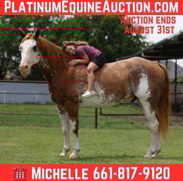 ONLINE AUCTION Place your bids at www.PlatinumEquineAuction.com Starting Bid $3500 Auction ends August 31st, 2025 Need a new saddle? Check out White Rock Saddles on our website or Facebook Safe • Seasoned • Stunning… If you’re looking for a once-in-a-lifetime kind of horse, Cadillac might just be your perfect match. This gorgeous 14-year-old Paint gelding is the definition of safe, broke, and beautiful — with a temperament as smooth as his ride. He stands 15hds tall and is built to last. Cadillac is the kind of horse everyone wants in their barn. He’s extremely user-friendly — absolutely anyone can get along with him. From first-time riders to seasoned hands, kids to grandparents, Cadillac makes everyone feel confident in the saddle. He’s been the go-to horse for the entire family and has earned his reputation as a true gentleman. He’s been extensively trail-ridden and handles new places like a pro. He’s confidently been ridden down at the Fort Worth Stockyards, in parades, and on busy roads. You won’t find him blinking at traffic, noise, flags, or commotion — he’s been there, done that, and is unbothered by it all. Cadillac is extremely fancy broke: ✔ Picks up both leads with ease ✔ Smooth, collected lope ✔ Big, Smooth stop ✔ Light in the bridle ✔ Handy turnarounds ✔ Neck reins like a dream Take him to the ranch, use him for light work, ride him down the trail, or show him off in town — he’s as versatile as they come. With his flashy splashed-up Paint color, he turns heads wherever he goes, and his solid, calm demeanor makes him a true pleasure to own. Whether you’re looking for a safe trail mount, a parade horse, a ranch horse, or a family-friendly gelding that everyone can enjoy — Cadillac delivers. Horses like him don’t come around often, and when they do, they don’t last long. Don’t miss the chance to own this one-of-a-kind, been-there-done-that gelding who’s as reliable as the day is long. He is UTD on everything, teeth just floated,fresh new shoes,vaccines, and he will also come with a brand new coggins and a health certificate. We are open to anyone interested in him to schedule a time to come see him or if you can’t make it schedule a FaceTime showing to see him. If you need help with transport don’t hesitate to ask we have a list of reputable haulers that can get him safely to your doorstep WORLD WIDE including, Alaska , Mexico, Hawaii, Canada and anywhere in between from Stephenville, TX. If you have any questions contact Michelle with M$ Performance Horses 661-817-9120. ONLINE AUCTION Place your bids at www.PlatinumEquineAuction.com Starting Bid $3500 Auction ends August 31st, 2025 Need a new saddle? Check out White Rock Saddles on our website or Facebook