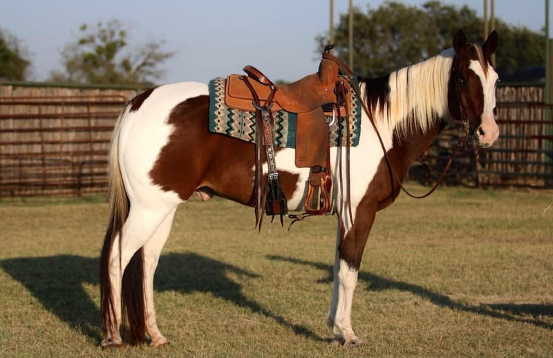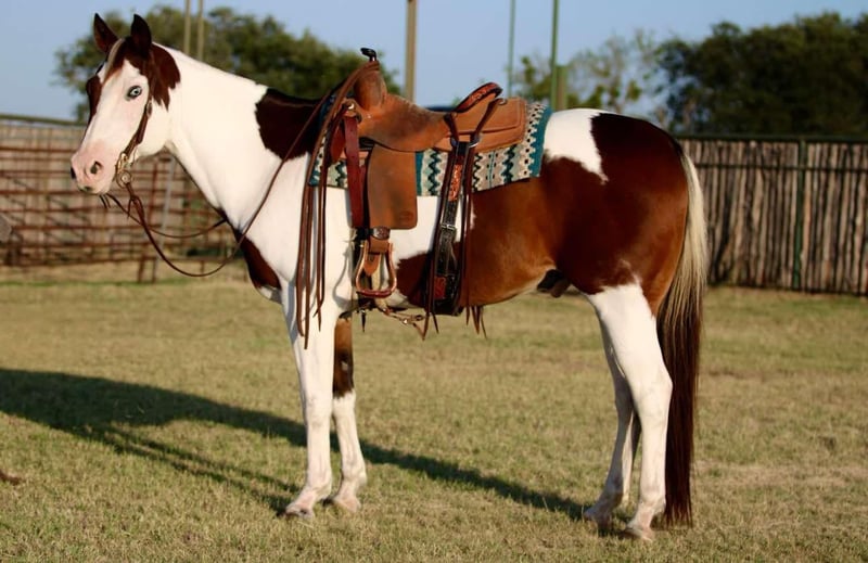 ONLINE AUCTION Place your bids at www.PlatinumEquineAuction.com Starting Bid $3500 Auction ends November 17th, 2024 Need a new saddle? Check out White Rock Saddles on our website or Facebook! Are you ready to own one of the prettiest paint geldings you’ve ever laid eyes on? Well meet 2Faced! He is most definitely one of a kind! He is sure to turn heads anywhere you take him! 2Face is an 13 year old grade gelding. He stands at 15hh tall. He has the most precious face with the prettiest, gentle and kind eye. This pristine gentleman has been used for almost anything you can think of. He is an excellent trail horse! He will gladly climb up or down anything that you point his nose towards. He will happily go through any body of water without missing a beat. He is not spooky on the trails and can handle any situation that you might encounter, whether that be wildlife, fallen trees, ditches, or treacherous terrain. He is a great leader, but also has no issues falling behind in the back if you want him to. He is calm and sure footed. Cow wise, 2Faced has been used to ride through them by and sort at multiple ranches. He will work to make his rider happy and get the job done. He has been hauled out to town and to rodeos with many distractions and keeps his head in the game! He truly is a blessing. He is a breeze to catch and will come up to you anytime he sees you at the gate. He will load in any trailer without any fuss. He stands tied patiently for anything you decide you would like to do with him. He is an absolute gentleman to the farrier and vet. You can shoe him or leave him barefoot, either way is fine by him. He loves baths as well. 2Faced is the perfect addition to any barn. He has such a sweet disposition and loves attention and affection. Located in Lipan Texas We can help arrange hauling anywhere in the US, Hawaii or Canada! Please call or text 817-659-3778. ONLINE AUCTION Place your bids at www.PlatinumEquineAuction.com Starting Bid $3500 Auction ends November 17th, 2024 Need a new saddle? Check out White Rock Saddles on our website or Facebook!