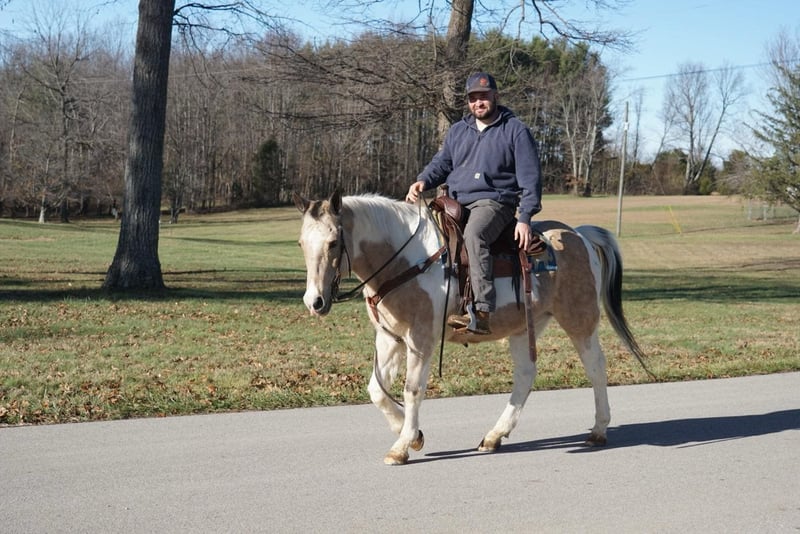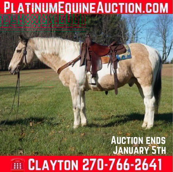 ONLINE AUCTION Place your bids at www.PlatinumEquineAuction.com Starting Bid $3500 Auction ends January 5th, 2024 Need a new saddle? Check out White Rock Saddles on our website or Facebook! Cookie Dough is a 14 year old Buckskin Paint gelding! He stands 14.3 hands tall and has a chunky build! He is cute as a button! Has pretty markings and has a great personality! He is a very laid back horse that is very simple to ride! The best part about him is he is safe! His favorite speed is slow but he will get up and go when asked! He will walk, trot, and lope! His favorite place to be is on the trails! He has been ridden all over Kentucky and Tennessee on over night camping trips! He is very seasoned out in the woods! He has been ridden in parades as well! He is easy to catch and handle and can stay fat on air basically! Super easy keeper! If you’re looking for a laid back teenage gelding to take care of you then don’t miss out on Cookie! He is cute as a button and an easy operator! Located in Rineyville Ky! Call Clayton Ryan 270-766-2641. ONLINE AUCTION Place your bids at www.PlatinumEquineAuction.com Starting Bid $3500 Auction ends January 5th, 2024 Need a new saddle? Check out White Rock Saddles on our website or Facebook!