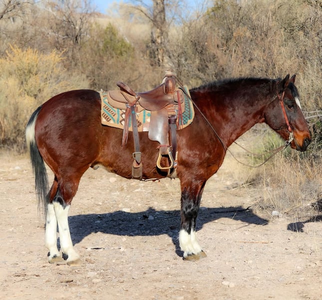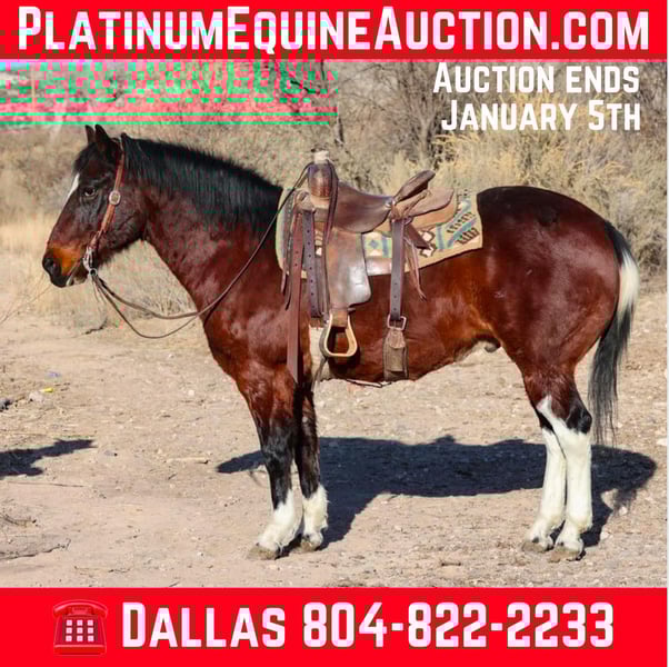 ONLINE AUCTION Place your bids at www.PlatinumEquineAuction.com Starting Bid $3500 Auction ends January 5th, 2024 Need a new saddle? Check out White Rock Saddles on our website or Facebook! Porky is a 14 year old grade paint gelding standing 15.1hh and as stout made as a tank!! If you’re looking for an absolute gentlemen to mosey on down the trails then look no further, Porky is your man! This awesome gelding will go absolutely any direction you point him. Through any brush, rocky riverbeds, flowing rivers, up and down steep terrain, and he will be sure footed while doing so! Not only is Porky an absolute blast to trail ride, he will walk trot and lope both ways in the arena with ease! Porky is easy to catch, good to groom, saddle, bridle, and bathe. Porky will come with a clean coggins and health, as well as a lameness exam. Transport can easily be arranged anywhere in the US!!! Located in Camp Verde, AZ Contact D/C Equine Services Dallas 804-822-2233. ONLINE AUCTION Place your bids at www.PlatinumEquineAuction.com Starting Bid $3500 Auction ends January 5th, 2024 Need a new saddle? Check out White Rock Saddles on our website or Facebook!