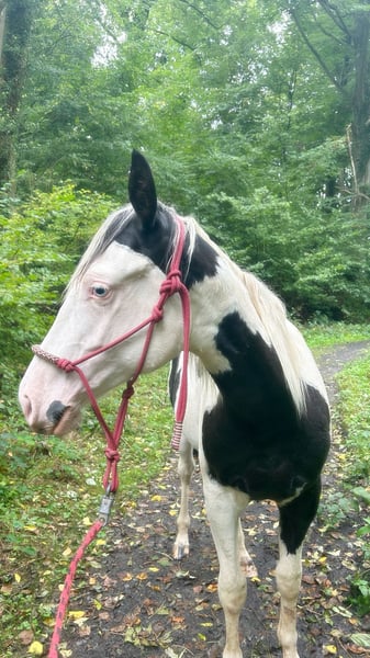 Cavallo da lavoro Paint Horse, castrone Tovero con due occhi azzurri.