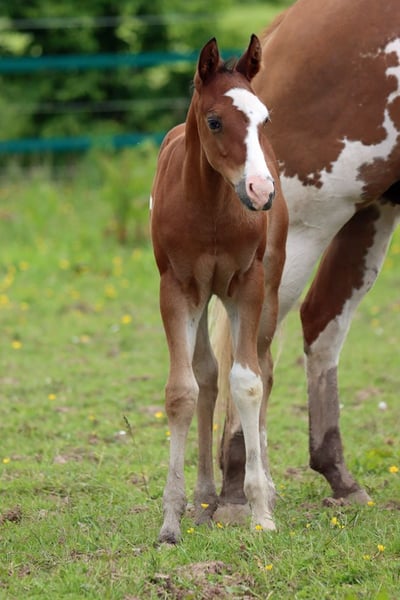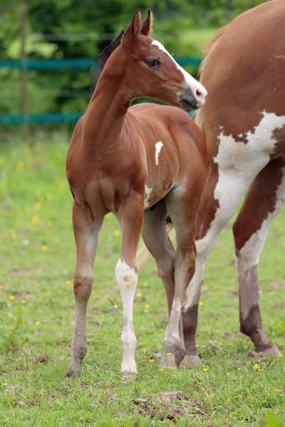 CHEYENNES JUJU PISTOL Bay frame overo Étalon APHA Né le 12.05.2024 Taille finale environ 150 cm 5 Panneau et IMM N/N Ee Aa LWO/N