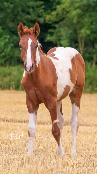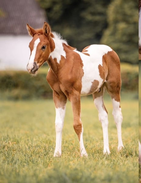 Beautiful Paint Stallion. Very friendly and people-oriented. Good basic gaits. Evenly drawn with 2 dark eyes. Father is licensed at the PHCG. Dam is also awarded as the champion mare of the breed show. In the pedigree there are sires such as Merada Chex, Doc Chex, Yellow Mount, Sugar Bars, Doc Quixote and Smart Chic O Lena. Grows up in herds. 5Panel test by parents With PHCG passport and American papers. Please contact us by phone at 0175/7217229