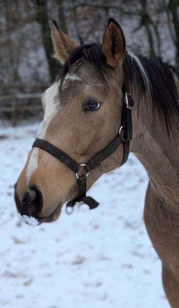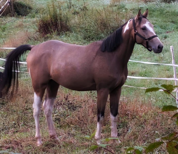For Sale: American Paint Horse Gelding out of a Thoroughbred Mare – Buckskin, born 2023 We are offering our beautiful American Paint Horse gelding for sale. Born in 2023, he impresses with his striking Buckskin coat and remarkable coloration. Standing at 15.3 hh, he is perfectly suited for leisure riding. The gelding is friendly, well-balanced, and ideal for recreational use. He is healthy, regularly vaccinated and dewormed, and gradually introduced to handling. His gentle nature makes him an excellent companion. If you are interested or would like more information, we look forward to hearing from you. Location: [insert location]