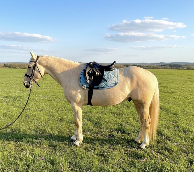 ⚜️ Buddy ⚜️ 2022 Paint Mix Height: 153 cm – Attention, there is a mistake, he is actually 144 cm! Barefoot Healthy Health certificate available! Buddy is a handsome, curious, and eager-to-learn all-round Palomino gelding. He is used to turnout / pasture keeping & stable at night! He is very social and can be turned out with any other horse. He grew up healthy and appropriately in a herd on large pastures at the breeder’s, and before being sold to his current owner, he was already backed. To reinforce his basic training and support his further development, he came to us for training. Buddy is incredibly eager to learn and open to any task, as he has not experienced anything negative so far. He is accustomed to groundwork, lunging, including halter work. He is familiar with working over poles and cavaletti. Under saddle, basic trail riding skills have been developed, including lateral movements. He moves reliably and simply in response to aids in all gaits. He can be ridden with or without spurs. He is used to going on the bit. Lateral canter work has been started. He stops reliably from any situation. I could also very well imagine him in an English saddle and further supported in that direction, as he is very soft in the contact. Buddy is suitable for riding alone or in a group in all gaits in the terrain. He is mentally alert but also sensitive and young. We have laid a good foundation for his future. We wish for him a loving home where he will be further supported; then you will get a true “Buddy” – a friend with whom you can simply have fun. Current video: https://youtube.com/shorts/_wm1ZAjrPMQ?si=5Ai1Jl7FBixtIHDG We are happy to take the time for a trial ride and charge €40. Since Buddy is still fully under saddle with us, we are looking for a new home for him by order. PLEASE ONLY CONTACT US IF YOU ARE SERIOUSLY INTERESTED!!!