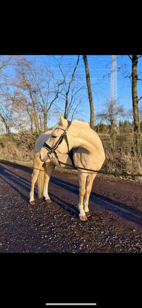 ⚜️ Buddy ⚜️ 2022 Paint Mix Stkm. : 153 cm - Achtung Fehlerteufel er ist 144 ! Gesund AKU vorhanden! Video : https://youtube.com/shorts/dvhctrcvXH0?si=jK2_wskn-lB4v7vW Buddy ist ein schicker, neugieriger und lernwilliger Allround - Palomino Wallach. Er kennt Weidehaltung / Offenstall & Box nachts ! Er ist sehr sozial und man kann ihn zu jedem Pferd dazustellen. Er durfte auf großen Weiden in der Herde beim Züchter gesund & artgerecht aufwachsen und wurde vor dem Verkauf, an die jetzige Besitzerin, noch angeritten. Damit seine Grundausbildung gefestigt - und er weiter gefördert wird, kam er zu uns ins Training. Buddy zeigt sich unglaublich lernwillig & ist für jede Aufgabe offen, denn er hat auch bisher nix schlechtes erlebt. Er kennt es vom Boden gearbeitet zu werden, Longieren, auch am Halfter. Stangen & Cavaletti - Arbeit. Beim reiten wurden Trail Basics erarbeitet, Seitengänge, Alle Gangarten geht er solide und einfach in den Hilfen. Man kann ihn mit & ohne Sporen reiten . Er kennt es am Zügel zu gehen. Aussengalopp wurde angefangen. Er bleibt aus jeder Lebenslage stehen. Ich könnte ihn mir auch sehr gut im Englisch -Sattel und bei weiterer Förderung in dieser Richtung vorstellen, da er super weich in der Anlehnung ist. Buddy geht alleine & in der Gruppe alle Gangarten ins Gelände. Buddy ist kopfklar, aber auch sensibel & jung. Wir haben für seine weitere Zukunft einen guten Grundstein gesetzt. Wir wünschen uns für ihn ein liebevolles zu Hause, wo er weiter gefördert wird, dann wird man ein richtigen „ Buddy“ ( Freund) bekommen, mit dem man einfach Spaß haben kann. Für ein Probereiten nehmen wir uns gerne Zeit und berechnen 40€. Da Buddy aktuell bei uns noch im Vollberitt steht wird i. Auftrag ein neues zu Hause gesucht. BITTE NUR BEI ERNSTHAFTEM INTERESSIERE MELDEN!!!