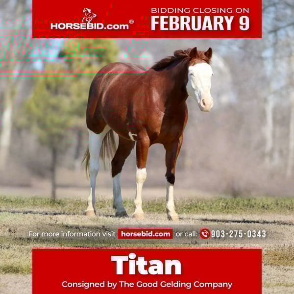 ❤️🔥𝑩𝒆 𝑴𝒊𝒏𝒆 𝐒𝐄𝐋𝐄𝐂𝐓❤️🔥 Happening now thru MONDAY | FEBRUARY 9th - Available EXCLUSIVELY on HorseBid's website! For more details and to register visit: www.Horsebid.com CONSIGNOR CONTACT: The Good Gelding Company 903-275-0343 LOCATION: Athens, TX BREED: APHA REGISTERED: Yes REGISTERED NAME: Electric Gunz COLOR: Sorrel overo HEIGHT: 14.3 AGE: 4 GENDER: Gelding Electric Gunz, known as Titan, is a standout young gelding combining elite reining bloodlines, natural athleticism, and an exceptional mind. Striking in appearance with his sorrel overo coloring and bold blue eyes, Titan offers both the look and the substance sought by buyers. Bred to perform, Titan is by Epic Titan and out of an Electric Code daughter, a pedigree that reflects power, trainability, and proven performance. He is a legitimate reining prospect, showing the talent and feel desired for the show pen, while maintaining a quiet, willing demeanor that makes him enjoyable and confidence-building to ride. Beyond his breeding and ability, Titan stands apart for his exposure and seasoning at a young age. He has been ridden extensively throughout Texas and the Appalachian Mountains, confidently handling varied terrain, environments, and situations. His reliability and steady nature have made him a trusted mount, and he has even been used to help start other colts, highlighting his composure and dependability. Titan is forgiving, uncomplicated, and safe, suitable for riders of varying experience levels. He is the type that offers both potential and reliability—capable of progressing in a performance program while remaining a pleasure to ride every day. With his eye-catching presence, proven pedigree, and exceptional mind, Electric Gunz represents an opportunity to invest in a young gelding with the versatility, talent, and temperament to excel in a variety of programs.