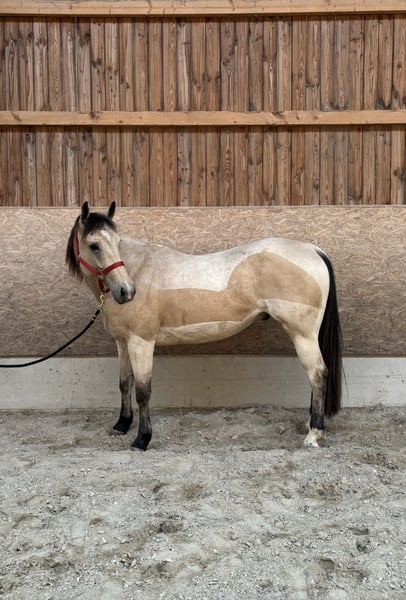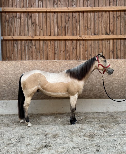 For sale: Our beautiful American Paint Horse Spirit Spirit is a 4-year-old American Paint Horse standing approximately 15.5 hands tall, with the rare Buckskin coat color. He is a very well-behaved and easygoing horse to handle. He has already been backed and ridden, but due to his growth, he has not been ridden for a while to allow him to develop calmly. Spirit has been out on rides in the terrain and remains attentive and relaxed during these outings. He is highly trainable, eager to please, and has a great attitude towards work. He is familiar with both stable and 24/7 pasture turnout and adapts well to different management systems. In everyday handling, he is also uncomplicated: * knows the farrier * loads willingly * well-mannered and cooperative * curious and eager to learn Spirit is a fantastic young horse with great potential for leisure riding, trail riding, or further training. Serious inquiries are welcome.