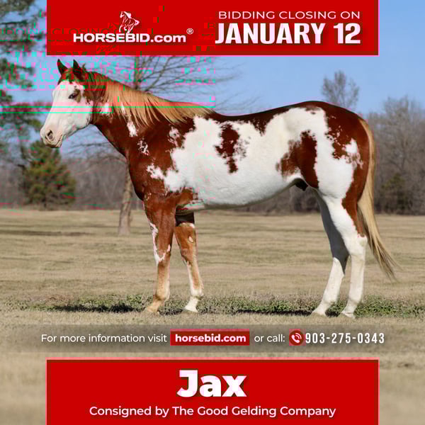 ♦️𝐍𝐄𝐖 𝐘𝐄𝐀𝐑'𝐒 𝑬𝒙𝒕𝒓𝒂𝒗𝒂𝒈𝒂𝒏𝒛𝒂♦️ Happening now thru MONDAY | JANUARY 12th - Available EXCLUSIVELY on HorseBid's website! For more details and to register visit: www.Horsebid.com CONSIGNOR CONTACT: The Good Gelding Company 903-275-0343 LOCATION: Athens, TX BREED: Apha REGISTERED: Yes REGISTERED NAME: I’m Only Fancy COLOR: Sorrel Overo HEIGHT: 16.2 AGE: 6 GENDER: Gelding Jax is a striking 16.2-hand APHA sorrel overo gelding with an exceptional mind, a kind heart, and the talent to go in multiple directions. Six years old and well bred, with lineage tracing back to Hot Ones Only and Red Charisma, he offers both quality and substance. He boasts a true “in-your-pocket” personality and an unflappable nature. Jax is forgiving, willing, and genuinely tries for his rider, making him a joy to have in the barn and under saddle. He’s the type that adapts to what you ask—steady, honest, and eager to please. Primarily experienced in English disciplines, Jax has been well started over fences and shows the scope, rhythm, and brain desired for the hunter ring. He has also been trail ridden extensively and confidently crosses all types of terrain, handling new environments with quiet confidence. With his size, temperament, and versatility, Jax would excel as an all-around partner, Hunter Under Saddle prospect, or Hunter/Jumper mount. His calm, sensible demeanor even lends itself well to cross-country schooling or fox hunting for a rider seeking a safe, enjoyable partner. If you’re looking for a big, beautiful gelding with a steady mind, proven exposure, and the willingness to do whatever is asked, Jax is one worth a closer look.