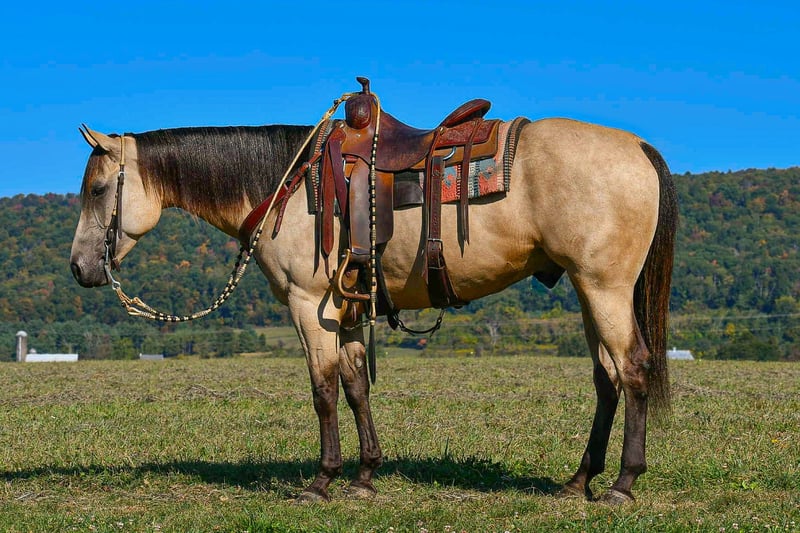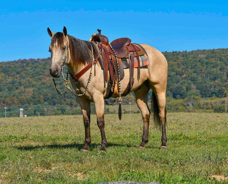 🍂 𝓐𝓾𝓽𝓾𝓶𝓷 𝑨𝑳𝑳 𝑺𝑻𝑨𝑹 𝑳𝑰𝑵𝑬𝑼𝑷 🍂 Happening now thru MONDAY | OCTOBER 6th - Available EXCLUSIVELY on HorseBid's website! For more details and to register visit: www.Horsebid.com CONSIGNOR CONTACT: Marlis Farms 814-777-0607 LOCATION: Rebersburg, Pa BREED: APHA REGISTERED: Yes REGISTERED NAME: Trashtotreasurecash COLOR: Buckskin HEIGHT: 15 AGE: 6 GENDER: Gelding “TRASHTOTREASURECASH” aka “Treasure” is a 6 year old, 15hh registered APHA gelding that truly lives up to his name as being a “treasure”. Pictures do not do this guy justice, he is BREATH TAKING in person! Treasure is “Mr. Personality” and the type of horse that would rather follow you in the house than be with the herd! He is the biggest love bug and will always leave a smile on your face! Not only is Treasure beautiful with a personality to match, but he is also extremely intelligent and very well educated under saddle! He is the most charming, kind, honest, fun, reliable and safe partner to have! In the arena, Treasure is very well balanced, his gaits are comfortable and his transitions are smooth. Treasure moves off seat and leg, but also listens to voices cues too! He rides English, western and bareback. As fancy as Treasure is, of course he comes with some buttons! He drops his head and will lope around collectively on a loose rein, he has a big stop and knows the word “woah”, he will back up, turn on his haunches, side pass and do a little spin! He is a BLAST to ride! Treasure is ready to hit the show ring and would really excel in the ranch riding classes, trail challenges or would be a beautiful western dressage horse! On the trails, Treasure is brave, willing, confident and super laid back! Not much rattles this guy! He crosses over logs, bridges, creeks and will ride up and down steep terrain! He is traffic safe and unbothered by scary objects like bikes, tractors, heavy equipment, SXSs, ATVs, horse drawn carriages, etc! He is not buddy or barn sour and can ride out alone or with a group and is happy anywhere in the pack! At home, Treasure is a really easy keeper on a simple forage based diet. He requires no maintenance or supplements, and can live inside or outside. He never complains as long as he’s getting love and attention! Treasure is polite with wonderful ground manners and is very well mannered for the vet, farrier and dentist! He loads and travels great and always stands tied quietly and patiently at new places! Treasure is good for all the normal barn tasks including bathing, clipping, grooming and tacking up. I never have to worry about who handles this gelding in the barn as I trust he is going to be good for kids and beginners! He has that “old soul” vibe to him and really loves being around people and children. Everyone who meets Treasure falls in love, he is truly one of a kind! Remember, wherever your heart is, there you will find your treasure!