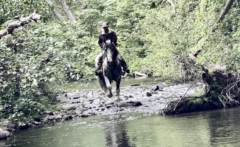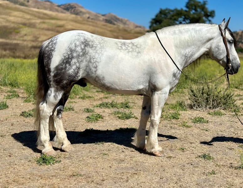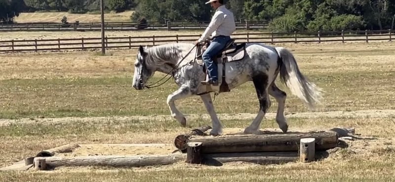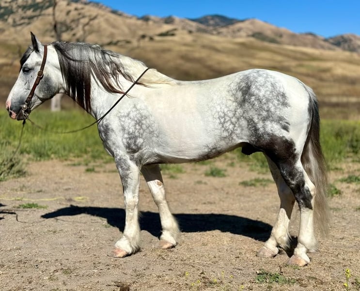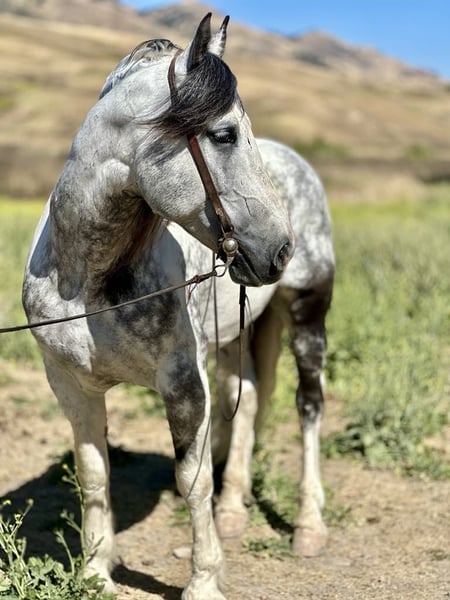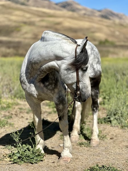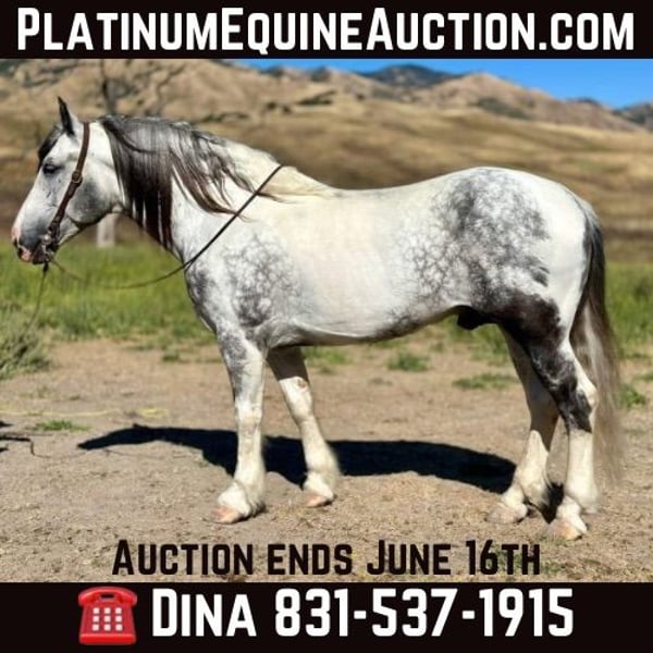 ONLINE AUCTION Place your bids at www.PlatinumEquineAuction.com Starting Bid $3500 Auction ends June 16th, 2024 Need a new saddle? Check out White Rock Saddles on our website or Facebook! Meet Koozie a 5 year old 15.2 hand dapple grey and white draft cross paint gelding. He is absolutely GORGEOUS in every way and such a good boy. He is sweet, personable, and gentle. Koozie stays quiet and easy to handle. Koozie rides western, bareback and English. He can be ridden by any rider of any level. He will walk on a loose rein all day, and move out when asked. Koozie is as comfortable as riding your lazy boy chair at every gait! He will go over small jumps in arena or fallen logs on trails. He is a trail master, will go anywhere he’s pointed. He’ll take you through the deepest water to cool off, into thick woods, or walk you right into town. He is alway on his best behavior and turns every head he passes. They don’t make them any prettier than him. Koozie has been desensitized to the flapping tarp, bouncing ball, And whipping flags! Koozie has also been used out on the ranch to gather and has doctored cattle in the pasture and been to the branding pen. This big boy travels like a horse half his size, he neck reins, collects while backing up, and uses his hind quarters when stopping. He will yield his hindquarters and responds to leg pressure. He catches both his leads effortlessly and lopes pretty perfect circles. Koozie can do rollbacks and lope right off. He has been an absolute joy to have at our ranch he will be greatly missed. Koozie cross ties, clips, bathes and is good for the farrier. He loads up easy and travels well. This gentle giant could go on to do great things. He has the soft, kind eye that makes a great horse. If you want a horse that you will fall in love with, Koozie is your man. Koozie will be the fan favorite everywhere he goes he is just stunning. Located in Paicines, CA. For more info call Longhorn Ranch Dina 831-537-1915. ONLINE AUCTION Place your bids at www.PlatinumEquineAuction.com Starting Bid $3500 Auction ends June 16th, 2024 Need a new saddle? Check out White Rock Saddles on our website or Facebook!