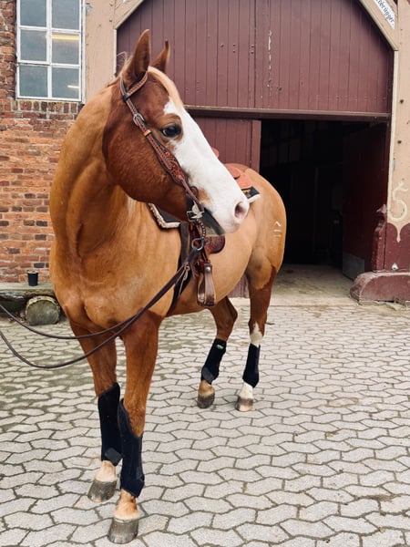 APH-Wallach sorrel overo 8 Jahre alt sucht neues 5* Zuhause. Er ist Reining ausgebildet mit gutem LTE, da erfolgreich Open und NonPro geshowed. Nach länger Verletzungspause wurde er 10/25 wieder antrainiert und eher allround geritten, was er ebenfalls super fein macht. Durch sein starkes Gangbild sehr gut für Ranch Disziplinen geeignet, aber auch in der Trail-Arbeit mit Stangen ist er sehr talentiert. Er hat vor nichts Angst, auch Tore und Türen aus dem Sattel raus öffnen sowie arbeiten mit dem Lasso kein Problem. Immer leicht zu händeln, egal ob an der Longe, an der Hand oder unter dem Sattel beim Tierarzt oder Schmied. Dank seiner soliden Grundausbildung und seinem tollen Charakter eignet er sich sowohl für den Freizeitreiter als auch für ambitionierteren Westernreiter. Bei Interesse stehe ich gerne für weitere Informationen und eine Besichtigung zur Verfügung. Melden gerne per WhatsApp 01712766618