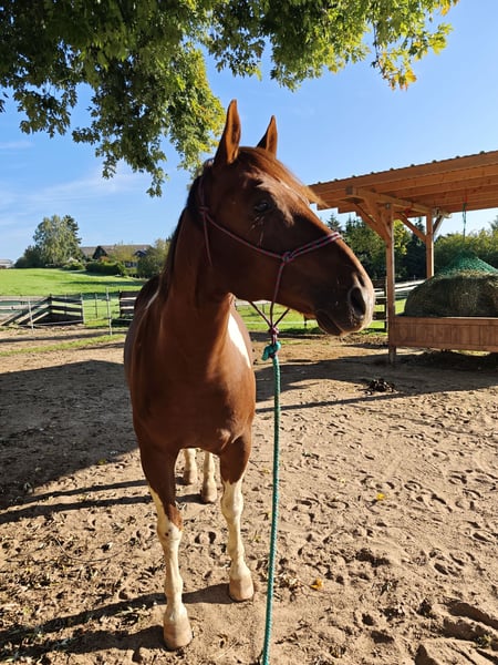 Foundation-bred Paint gelding from 2017 156 cm tall, large hooves, stable joints, older type. Regularly vaccinated and dewormed. Shoeing and loading well-behaved. Annual check-up by the dentist as well as physiotherapy/osteopathy. Familiar with box, paddock, and herd management; has been well-compatible with all and everywhere so far. Whether 4 hours or up to 24 hours of turnout, he has never had any issues. He is shod in all four hooves. In winter, he is blanketed with us. Ridden for leisure. In the last few months, he has only been ridden irregularly due to a lack of time. However, he handles this well; he is not the type to tear apart the box on days off. He has never bucked or bolted, but he does need clear, consistent guidance and is therefore only conditionally suitable for beginners. Not a forced sale; he will only go if the fit is right. Please only serious inquiries where there is genuine interest in purchasing. Also available with his equipment. Price depends on whether with or without equipment.