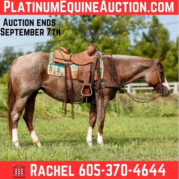 ONLINE AUCTION Place your bids at www.PlatinumEquineAuction.com Starting Bid $3500 Auction ends September 7th, 2025 Need a new saddle? Check out White Rock Saddles on our website or Facebook Meet Fancy a stunning 12 year old APHA red roan mare, standing 15.2 hands tall with 4 white socks she is sure to catch everyone’s eye! Fancy is absolutely gentle and quiet to be around! She’s been shown in ranch pleasure, showmanship, and been hauled to 4-H and playdays! Whether you’re looking for a reliable show partner or a confidence-boosting trail horse, she’s got you covered. Fancy is a dream to handle, with a sweet personality that makes her a barn favorite. She’s equally comfortable navigating arena patterns as she is exploring scenic trails. Her smooth gaits and responsive nature make her a joy to ride for riders of all levels. Fancy has been hauled to lots of state parks and has been on lots of camping trips! She stands tied, loads and hauls good, good for the farrier and vet! Fancy is easy to catch, saddles, bridles and stands for mounting! Super gentle family safe mare! Don’t miss the opportunity to own a horse that combines beauty, brains, and a gentle heart. Call or text Rachel at 605-370-4644 for more info! ONLINE AUCTION Place your bids at www.PlatinumEquineAuction.com Starting Bid $3500 Auction ends September 7th, 2025 Need a new saddle? Check out White Rock Saddles on our website or Facebook