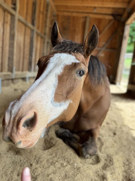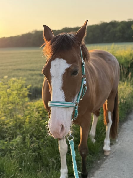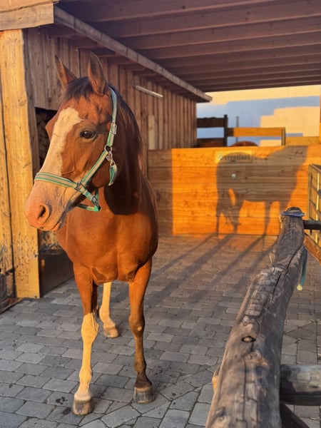 Bitte erst alles (!) lesen und nur wenn wirklich alles passt, sehr gerne melden! Platz vor Preis! Wenn wirklich alles passt, gebe ich meine Paint Stute (o.P.) in allerbeste Hände und artgerechte Haltung ab. Sie ist 13 Jahre alt, ca. 1,60m und ein ganz besonderes Pferd. Sie ist ein absolut rangniedriges und soziales Pferd, das so gerne einen Kumpel zur Fellpflege haben möchte. Gegenüber dem Menschen ist sie allerdings oft ein echtes „grumpy horse“ mit Nähe-Distanz-Problem. Daher nur in erfahrene und konsequente Hand, nicht für Kinder – und auf gar keinen Fall an Personen, die sie mit Druck und Macht „überzeugen“ wollen. Auf Druck reagiert sie mit gesteigerten grumpy-Attacken. Da sich ihr Verhalten bei Boxenhaltung verschlechtert, gebe ich sie nur… -> in Offenstallhaltung, -> mit fairen Artgenossen/Pferdegesellschaft, -> ausreichend Liege- Unterstell und Rückzugsmöglichkeiten und -> 24/7 Zugang zu Heu. Ich wünsche mir ein „für-immer-zu-Hause“ - Sie soll kein Wanderpokal werden! Sie hat einige Baustellen, daher hatte sie eine lange Pause und wird als bedingt reitbar verkauft. Rassetypisch ist sie weich gefesselt und positiv in der Beugeprobe. Anfang des Jahres machte ihr ein negativer Palmarwinkel / Hufbeinfehlstellung des Vorderfußes Probleme, der lange nicht diagnostiziert wurde. Durch die Fehlbelastung folgte eine beidseitige Sehenschneidenentzündung der Fesselbeugesehnen. Seit August läuft sie wieder lahmfrei. Mit Kunststoffbeschlag kommt sie nun gut zurecht, so dass sie seit ein paar Wochen wieder langsam im Gelände geritten wird. Sie wird kein 100% belastbares Reitpferd mehr werden können und ist auch nicht zur Zucht geeignet. Kein Gewichtsträger! Für Hallen-/Platzarbeit, reiten auf tiefem Boden oder mit vielen Wendungen oder auch fürs Longieren ist sie aufgrund der weichen Fesselung nicht (!) geeignet. Auf hartem Boden und geraden Strecken ist sie aber eine wunderbare Partnerin für gemütliche Geländeritte. Sie ist Western geritten. Im Gelände ist sie sicher und ein absolutes Verlasspferd: Ich reite sie immer gebisslos. Sie läuft alleine, auch auf völlig fremden Strecken, mit oder als Handpferd und war auch nach längeren Pausen immer brav und ist nicht schreckhaft. Insgesamt ist sie eher von der gemütlichen Sorte und eher etwas büffelig. Sie ist sehr klug und witzig. Sie kann einige Kunststückchen und wäre sicherlich von Zirkuslektionen und mehr zu begeistern. Spazieren gehen wir nur mit Halfter. Von Alltagsgeräuschen über Kettensägen bis zu Baustellenlärm – sie hat bisher nichts so schnell aus der Fassung gebracht. Beim Schmied und auch beim Tierarzt war sie immer brav. Ihre verhaltensoriginelle Seite hat sie sich bisher immer für uns aufgehoben ;)… Verladen? Für Futter tut sie fast alles ;)… Sie ist zwar länger nicht gefahren, aber ich habe regelmäßig Verladetraining mit ihr gemacht. regelmäßig geimpft, entwurmt und beim Schmied (4-fach Kunststoffbeschlag) Zähne gerade gecheckt Aktuelles Blutbild chiropraktische Vorstellung Anfang 2025 Es ist kein Notverkauf – ich suche für sie das perfekte „für-immer-zu-Hause“! Wenn du dir vorstellen kannst, meiner Paint Stute ein 5***** zu Hause zu geben und ihren Besonderheiten gerecht zu werden, freue ich mich über deine Nachricht -bitte mit vollständigem Namen und kurzer Vorstellung des künftigen zu Hauses ;). Komplettes Zubehör, inkl. eines passenden Westernsattels, kann miterworben werden.