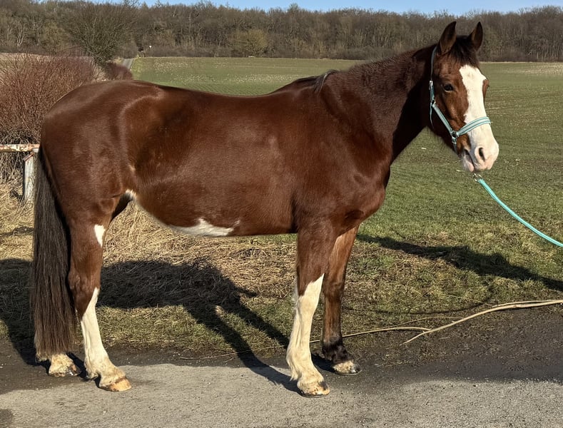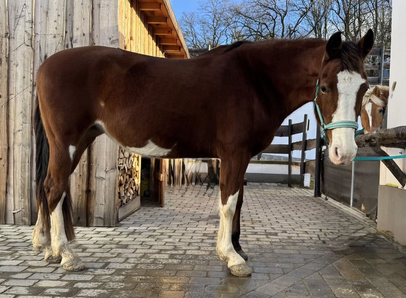 Please read everything carefully, and only contact me if everything fits perfectly! Priority over price! If everything is truly suitable, I am offering my Paint mare (O.P.) to the best possible hands and in humane, proper care. She is 13 years old, approximately 16.1 hh, and a very special horse. She is an absolutely low-ranking and social horse who would love to have a buddy for grooming. However, she can often be quite a “grumpy horse” with issues regarding closeness and distance to humans. Therefore, only for experienced and consistent riders, not suitable for children – and definitely not for those who want to “force” her with pressure and dominance. She reacts to pressure with increased grumpy outbursts. Her behavior worsens in box stall housing, so I am only offering her… -> in pasture turnout, -> with fair, compatible herd mates, -> with sufficient lying, shelter, and retreat options, and -> 24/7 access to hay. I am looking for a “forever home” – she should not become a trophy for collection! She has some issues, which is why she had a long break from riding, and she is sold as conditionally rideable. Breed typical, she is soft in the halter and positive in the bend test. Early this year, she had problems with a negative palmar angle/hook bone misalignment of the front hoof, which was not diagnosed for a long time. Due to the misload, she developed bilateral tendon sheath inflammation of the flexor tendons. Since August, she has been sound again. With synthetic shoes, she now manages well, and she has been gradually ridden in the outdoor terrain again for a few weeks. She will no longer be a 100% reliable riding horse and is not suitable for breeding. Not a weight carrier! For indoor or arena work, riding on soft ground, or with many turns, or for lunging, she is not suitable due to her soft tendons. On hard ground and straight stretches, she is a wonderful partner for relaxed trail rides. She has been ridden Western-style. In the terrain, she is safe and an absolute dependable partner: I always ride her bitless. She rides alone, even on completely unfamiliar routes, with or as a lead horse, and has always been well-behaved after long breaks; she is not spooky. Overall, she is more of a laid-back type and a bit of a “couch potato.” She is very intelligent and funny. She can do some tricks and would surely be excited about circus lessons and more. We only go for walks with a halter. From everyday noises to chainsaws and construction noise – she has never been easily spooked. She has always been well-behaved at the farrier and veterinarian. Her behavioral quirks she has always kept for herself ;)… Loading? She almost does anything for food ;)… She hasn’t been transported for a while, but I have regularly done loading training with her. Regularly vaccinated, dewormed, and with a 4-in-1 synthetic shoeing by the farrier. Teeth checked and aligned. Current blood test. Chiropractic check scheduled for early 2025. This is not an emergency sale – I am looking for the perfect “forever home” for her! If you can imagine giving my Paint mare a 5-star home and accommodating her special needs, I look forward to your message – please include your full name and a brief introduction of your future home. Complete tack, including a suitable Western saddle, can be purchased together.
