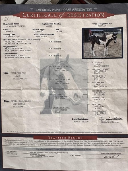 ONLINE-AUKTION Geben Sie Ihre Gebote unter www.PlatinumEquineAuction.com ab. Startgebot $3500 Die Auktion endet am 7. Juli 2024 Brauchen Sie einen neuen Sattel? Schauen Sie sich White Rock Saddles auf unserer Website oder Facebook an! Richter First Angel (Tibby) 2010 Reg. APHA 15 h Black / White Mare Wenn ich erklären sollte, was ein gut abgerundetes, vielseitiges Pferd ist, würde ich einfach unsere Stute Tibby beschreiben. Sie ist diese großartige Mischung aus einem schönen Körperbau (der die Gesundheit fördert), einem guten Gemüt und glänzt sowohl innerhalb als auch außerhalb des Reitplatzes. Sie hat eine umfangreiche Ausbildung sowohl in Western- als auch in englischen Disziplinen genossen. Tibby wurde auf unserem Hof für viele verschiedene Aufgaben eingesetzt, vom Unterricht über das Ausstellen bis hin zum Reiten im Gelände, und sie ist bereit, ein Ranchpferd zu sein, wenn man diese Richtung einschlagen möchte. Wenn es um englisches Reiten geht, ist Tibby eine Klasse für sich mit ihrem fließenden Trab und ihrer schönen Form über Zäune. Sie springt derzeit über 2'6" Parcours mit fliegenden oder einfachen Führungswechseln. Mit ihren Reitern hat sie mehrere Championate und Reservechampionate auf den Turnieren gewonnen. Tibby hat auch einen gewissen Westerncharakter und ist sehr handlich. Wir haben ein Seil von ihr geworfen, und sie zeigt viel Potenzial für ein großartiges Ranchpferd. Es macht ihr nichts aus, Planen zu spannen, Baumstämme zu ziehen, durch Tore zu gehen und mit Rindern in Kontakt zu kommen. Sie wäre ein außergewöhnliches 4H-Pferd für den Reiter, der gerne alles macht, und sie ist gut genug, um auch in der Zucht gezeigt zu werden. Tibby ist nicht nur ein Showpferd, sie ist auch ein sehr erfahrenes Trailpferd und war eines unserer Lieblingspferde für lange Ausritte. Wir sind erst kürzlich von einer einwöchigen Reise nach Eminence, MO, zurückgekommen. Mit ihr kann man das Trailreiten wirklich genießen, sie durchquert Wasser: Bäche und Flüsse, bewältigt alle Arten von steilem und unwegsamem Gelände ohne Probleme, und es spielt keine Rolle, ob man die Gruppe anführen oder das Schlusslicht bilden möchte. Sie ist nicht ängstlich oder reaktiv und fährt die Straße hinunter wie ein Profi. Tibby ist gesund, braucht keine Pflege, hat keine Untugenden und ist in Bezug auf Hufschmied, Coggins, Entwurmung und Impfungen auf dem neuesten Stand. Sie lässt sich leicht aufsatteln, steht für alle Pflegearbeiten und lässt sich leicht be- und entladen. Tibby ist ein echtes Allround-Pferd, das sich nicht nur auf das Reiten in der Arena oder auf das Ausreiten beschränkt. Sie ist bereit zu gehen und der Himmel ist die Grenze, was Sie alles mit ihr tun können. Für weitere Informationen rufen Sie bitte an oder senden Sie eine Nachricht an Cara Thomas 812-704-6388 in Borden IN. ONLINE-AUKTION Geben Sie Ihre Gebote unter www.PlatinumEquineAuction.com ab. Startgebot $3500 Die Auktion endet am 7. Juli 2024. Brauchen Sie einen neuen Sattel? Schauen Sie sich White Rock Saddles auf unserer Website oder Facebook an!