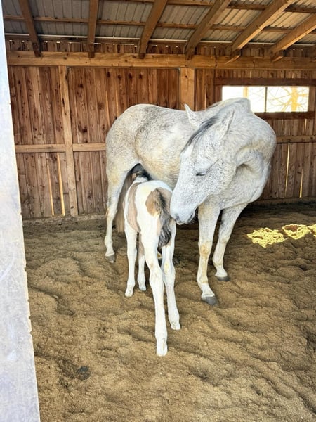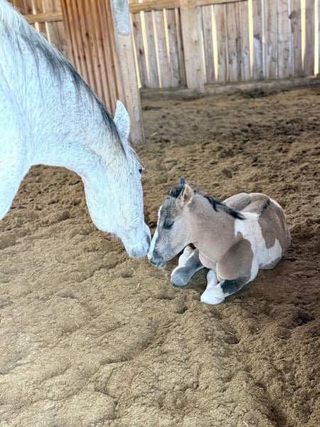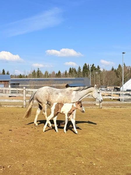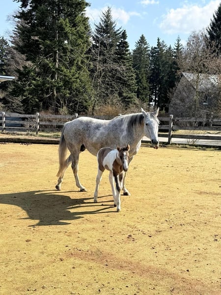For sale is a well-built American Paint Horse mare with a current foal at her side. The mare is registered with the PHCG. The foal was born on March 20, 2026, and already shows correct conformation, curiosity, and a friendly nature. The sire of the foal is DK DANCING BOYS SMOKY. Due to this pairing, the foal is suitable for both sport and breeding purposes. The sire is located at our facility. The mare is a reliable mother and can be sold separately after weaning her foal. The foal can also be sold separately if desired. Prices: - Mare with foal at her side: €15,000 - Mare alone: €6,000 - Foal alone: €10,000 The sale will be made to caring and suitable new owners. Further information gladly available upon request.