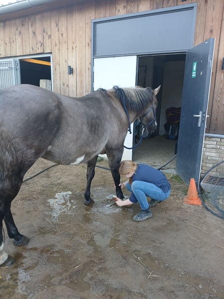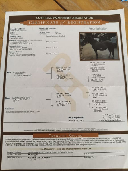 Kaya is een veelzijdige merrie, of het nu een western zadel of engels zadel is. Of het in de rijbak of in het bos is. Of het een sprongetje maken is of een dressuurproefje. Of werken met een koe, deze merrie doet het allemaal, een brave allrounder. Kent stops, rollbacks, spins, zijwaarts en een galopwissel. Met Kaya is het opstappen en wegrijden, ook na een tijd niet rijden. Ze wordt verkocht omdat ze niet in onze kleine merriekudde past. Waar ze hiervoor gestaan heeft, stond ze in een wat grotere gemende kudde en daar had ze het super naar der zin. Ze is drachtig voor een veulen in juni 2026 van Hickorys Gunsmoke, dunskin homozygoot Tobiano, dus altijd een bont veulen, met vele kleur mogelijkheden. Ook hickory is een hele brave alleskunner. Kaya is 6 panel N/N en OLWS/N en Hickory is 7 panel N/N. Kaya is braaf bij hoefsmid/dierenarts en laad alleen op de trailer. Is in orde met entingen/paspoort en APHA papier. Ze houdt van een poets-/wasbeurt. Onze dochter van 11 haalt haar alleen uit de wei, poets en zadelt zelf. Helaas is ze luchtzuiger en krijgt 1 stalbeen achter van stilstaan in een beperkte ruimte, ze ondervind daar geen last van. Ze staat bij ons 24/7 buiten, met gras/ volle hooiruif/ brok en natuurlijk een schuilstal. We zoeken voor haar een plek waar ze ook 24/7 buiten kan zijn. Het liefst zien we haar verhuizen naar een plek waar ze ook voldoende beweegt uit zichzelf, zoals een paddock paradise. Op alleen vragen naar de prijs wordt niet gereageerd, we zoeken voor haar een hele goede plek!