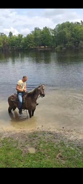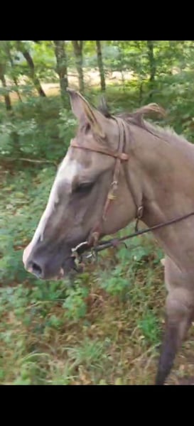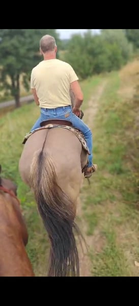 Kaya is a versatile mare, whether it’s in a western saddle or an English saddle. Whether it’s in the riding arena or in the woods. Whether it’s jumping or doing a dressage test. Or working with a cow, this mare does it all, a well-mannered all-rounder. She knows stops, rollbacks, spins, side passes, and a flying change. With Kaya, it’s just a matter of getting on and riding away, even after a break from riding. She is being sold because she does not fit into our small mare herd. Previously, she was in a larger mixed herd and she was very happy there. She is in foal for a June 2026 foal by Hickorys Gunsmoke, a dunskin homozygous Tobiano, so it will always be a pinto foal, with many color possibilities. Hickory is also a very well-mannered all-rounder. Kaya is 6 panel N/N and OLWS/N, and Hickory is 7 panel N/N. Kaya is good with the farrier/veterinarian and loads easily onto the trailer. She is up to date with vaccinations/passport and APHA papers. She loves to be groomed/bathed. Our 11-year-old daughter brings her in from the pasture, grooms, and saddles her by herself. Unfortunately, she is a windsucker and gets one stable leg from standing in a limited space, but she does not suffer from it. She is kept outside 24/7 with grass/full hay feeder/ pellets and of course a shelter. We are looking for a place for her where she can also be outside 24/7. Ideally, we would like her to move to a place where she can also move around enough on her own, such as a paddock paradise. Inquiries about the price alone will not be answered; we are looking for a very good home for her!