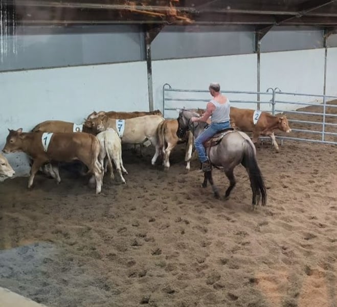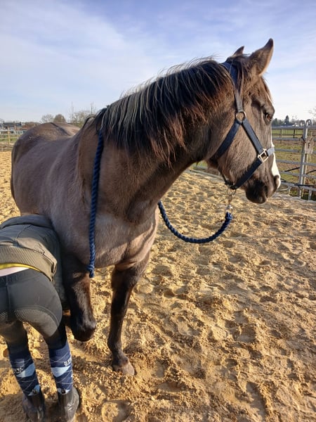 Kaya ist eine vielseitige Stute, egal ob mit Westernsattel oder englischem Sattel. Ob in der Reithalle oder im Wald. Ob es darum geht, einen Sprung zu machen oder eine Dressurprüfung zu reiten. Oder mit einer Kuh zu arbeiten, diese Stute kann alles, ein braver Allrounder. Sie kennt Stops, Rollbacks, Spins, Seitwärtsbewegungen und einen Galoppwechsel. Mit Kaya kann man einfach aufsteigen und losreiten, auch nach längerer Pause. Sie wird verkauft, weil sie nicht in unsere kleine Stutenherde passt. Wo sie zuvor stand, war sie in einer etwas größeren gemischten Herde und dort hat sie sich sehr wohl gefühlt. Sie ist tragend für ein Fohlen im Juni 2026 von Hickorys Gunsmoke, einem homozygoten Tobiano Dunskin, also wird es immer ein geschecktes Fohlen mit vielen Farbvariationen geben. Auch Hickory ist ein sehr braver Alleskönner. Sowohl Kaya als auch Hickory sind 7 Panel N/N. Kaya ist brav beim Schmied/Tierarzt und lädt sich alleine auf den Anhänger. Sie ist in Ordnung mit Impfungen/Pass und APHA-Papieren. Sie liebt es, geputzt und gewaschen zu werden. Unsere 11-jährige Tochter holt sie alleine von der Wiese, putzt und sattelt sie selbst. Leider ist sie Luftschnapper und hat ein Hinterbein, das von längerem Stehen in einem begrenzten Raum betroffen ist, aber sie hat damit keine Probleme. Sie steht bei uns 24/7 draußen, mit Gras/voller Heuraufe/ Kraftfutter und natürlich einem Unterstand. Wir suchen für sie einen Platz, wo sie ebenfalls 24/7 draußen sein kann. Am liebsten sehen wir sie an einen Ort ziehen, wo sie sich auch ausreichend selbst bewegt, wie in einem Paddock Paradise. Auf Anfragen nach dem Preis wird nicht reagiert, wir suchen für sie einen sehr guten Platz!