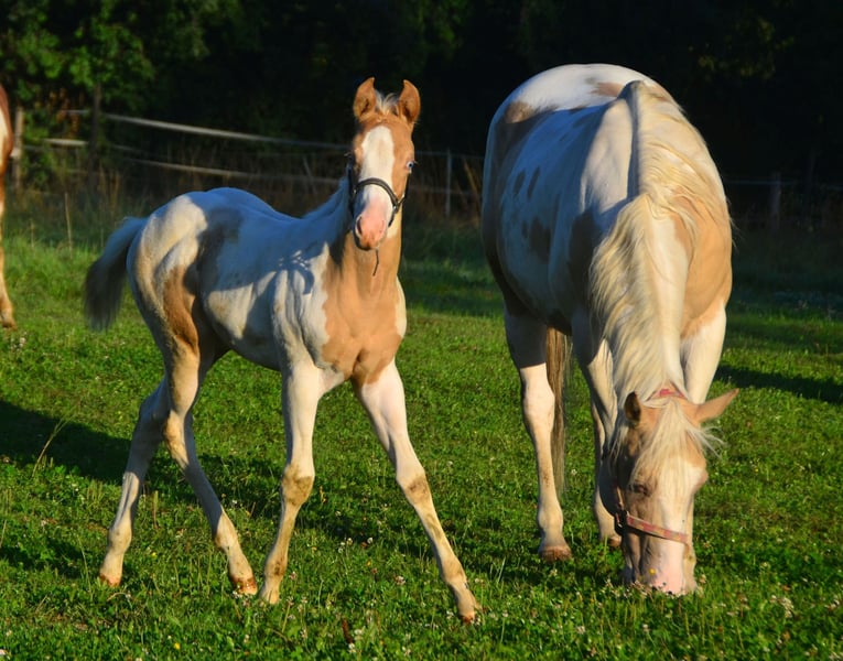 Brezel is homozygous for Tobiano and Champagne! Her foals will always be colorful and Champagne colors. She herself is a Gold Champagne pinto. Of course also 7 panel N/N. She gets passport and papers from the APHA and PHCG. Brezel has a blue eye. She is a little heartbreaker who really demands to be scratched.