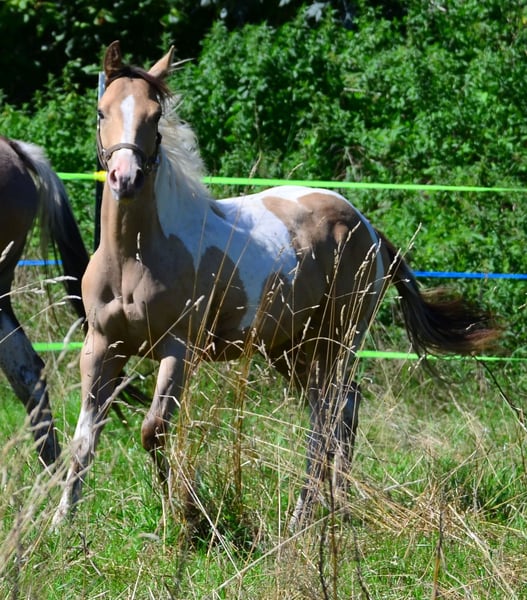 Miral is Amber Champagne, a brilliant mover and a very sweet, gentle nature. She is homozygous for the tobiano gene and will only ever produce colorful foals. She is a Paint Horse with full paper and 7 panel N/N. Grows up here in a species-appropriate manner in a large herd. She will of course be regularly wormed and vaccinated, with papers and passport.