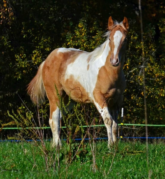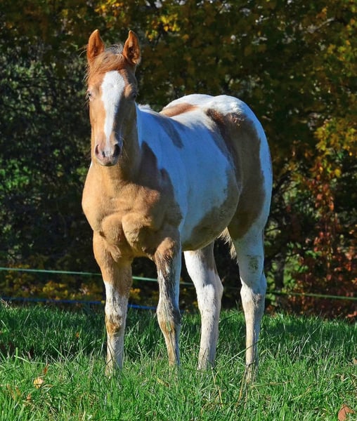 Babatte est une pouliche Paint Horse de couleur Gold Champagne, porteuse du gène Champagne de manière homozygote. Elle a été présentée lors du concours de reproduction PHCG et a obtenu une note globale exceptionnelle de 7,95. Elle est N/N pour le panel de 7 tests génétiques et possède naturellement tous ses papiers Paint. Elle grandit dans un environnement adapté, au sein d’un grand groupe. Son caractère est d’un tempérament en or : elle cherche toujours à faire plaisir. Très câline, elle recherche la proximité avec l’humain de manière douce et naturelle.