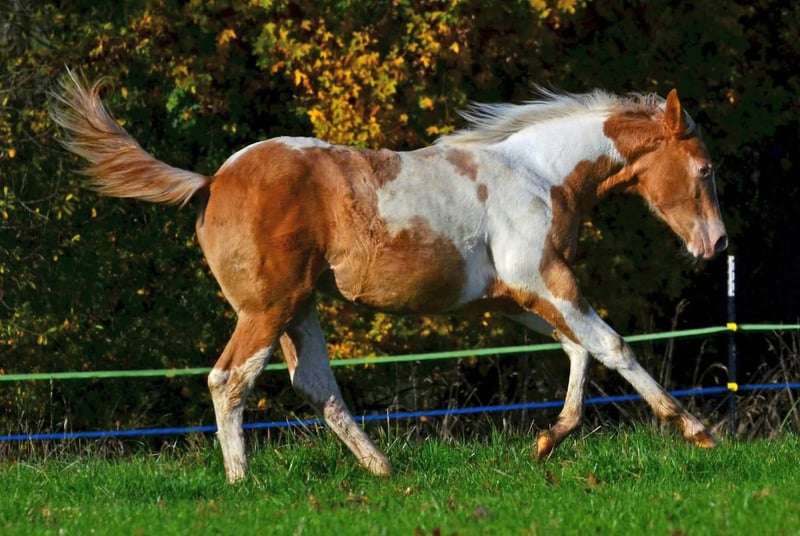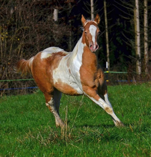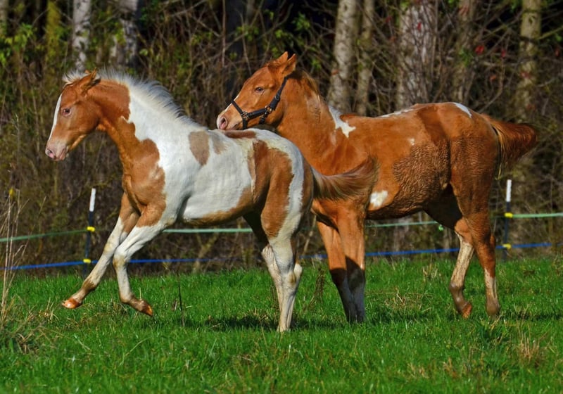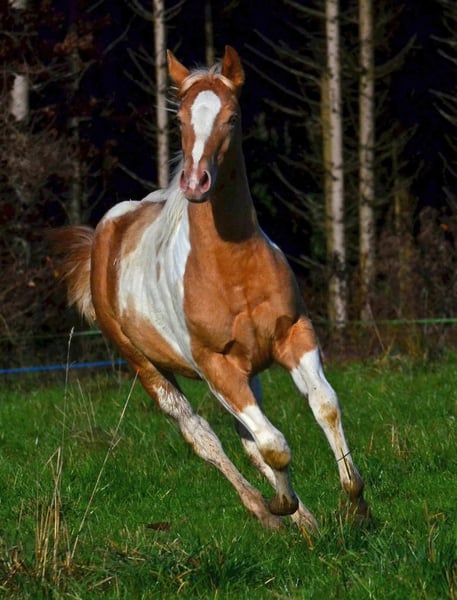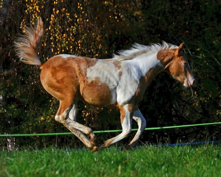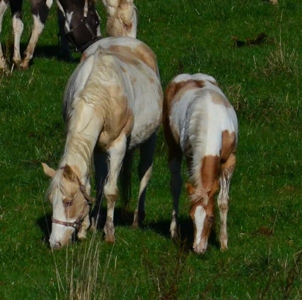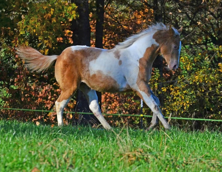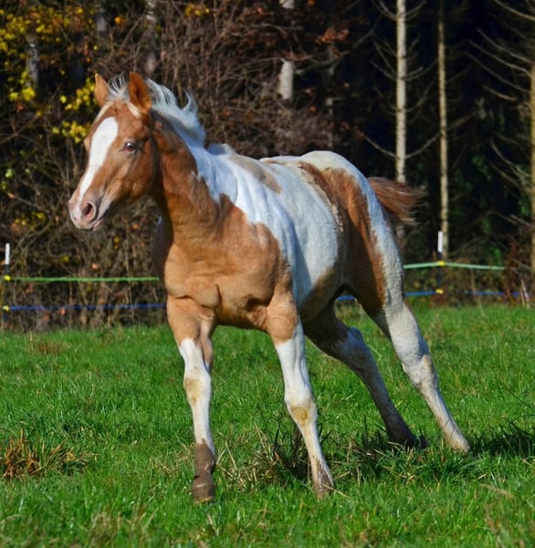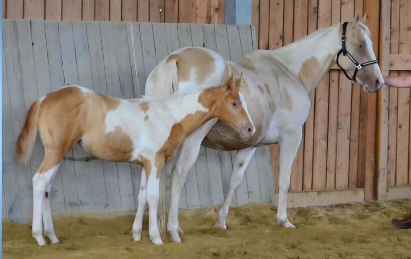 Babatte is a Paint Horse filly in Gold Champagne, homozygous for the Champagne gene. She was presented at the PHCG breeding show and received an impressive overall score of 7.95. She is 7 Panel N/N and naturally has full Paint papers. She is growing up in a large herd in a species-appropriate manner. Her character is golden, and she always wants to please. She loves to cuddle and seeks human closeness in a gentle way.