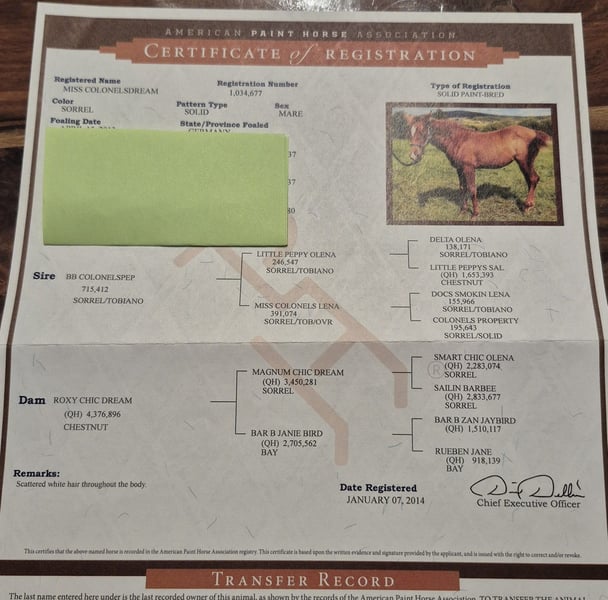 Mutter und Vater gehen zurück auf Doc Bar dessen Nachkommen in den Disziplinen Reining, Barrel Racing und Halter laufen und erfolgreich sind.