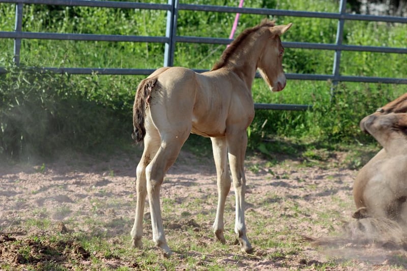 CHEYENNES VUDUGUNFIRE Amber Dun Champagne APHA Stute Geboren: 08.05.2025 Endgrösse ca 153 cm 7 Panel N/N Ee Aa Dd CHch