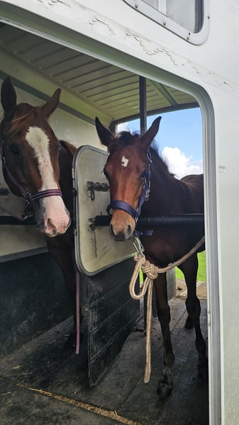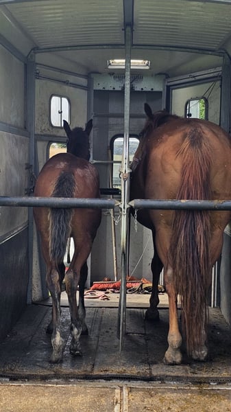 Maggy darf sich frei entwickeln, nur die Basics lernt sie spielerisch mit. Dazu gehören Anhängerfahren, Hufegeben, Anbinden und die Anfänge der Halfterführigkeit.