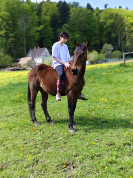 With a heavy heart, I have decided to sell my first horse. I purchased Daphne a little over a year ago. She was advertised as an beginner-friendly horse and teacher, but she is definitely not suitable for beginners. I bought her as a leisure riding horse, but she is completely unridable due to a damaged back, which is likely caused by an ill-fitting saddle. - Only available for pasture turnout - Not compatible with other mares - Unrideable - Only to be used as a companion horse - Crossbreed I wish for Daphne (as I affectionately call her) to find a wonderful new home where she can enjoy her retirement and possibly be involved in some ground work or be a hand horse for light activities. She can be sold with accessories such as a lunging girth, leg protection, bandages, halter, etc. She is not suitable for beginners, as she has her quirks and often shows signs of heat, which she sometimes expresses through "stallion-like" behavior. She will only be sold to a suitable, caring home. Price negotiable.