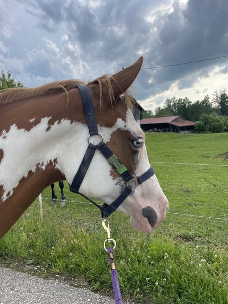 American Paint Horse Stutfohlen „Rio Rima Boon“ – traumhafte Abstammung! Aus Zeitmangel gebe ich mein wunderschönes Paint Horse Stutfohlen „Rio Rima Boon“ in beste Hände ab. Sie wurde am 07. April 2024 in Deutschland geboren und ist bei der American Paint Horse Association (APHA) registriert. Allgemeine Daten: • Name: Rio Rima Boon • Geschlecht: Stute • Geboren: 07.04.2024 • Farbe: Sorrel Overo • Eltern: • Vater: Listo Smoking Gun • Mutter: Miss Jessie Boon • Zuchtverband: American Paint Horse Association (APHA) • Besonderheit: Beide Augen blau Beschreibung: Rio Rima Boon ist ein sehr korrekt gebautes, neugieriges und aufgeweckte Stute mit toller Bewegung und ruhigem Wesen. Sie wächst artgerecht im Herdenverband auf, kennt Halfter, Putzen und bereits auch Bodenarbeit , das Arbeiten mit Stangen macht ihr besonders viel Spaß. Beim spazieren gehen, ist sie sehr unerschrocken und geht stets immer mutig voran. Durch ihre ausgezeichnete Abstammung eignet sie sich später auch mal für die Zucht. Rio gewann die PHCG Fohlenschau mit einer 8,05 und trägt den Vizechampiontitel des Bundeschampionats.