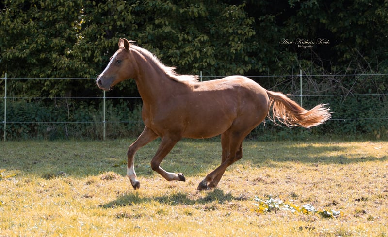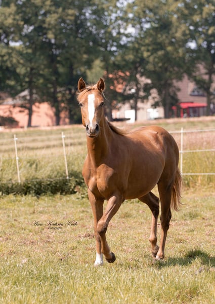 Peach is a typical mare with a long flaxen mane and ticked hairs. She is growing up well-socialized in a mare herd. She is familiar with trailer loading, farrier work, and is regularly dewormed. She comes from excellent parents; her father is Mc Oleaner (among others, a 4-time Futurity winner NRHA, 2-time Derby winner), and her mother is the full sister of the successfully shown Doctors Diamond (Grischa Ludwig).