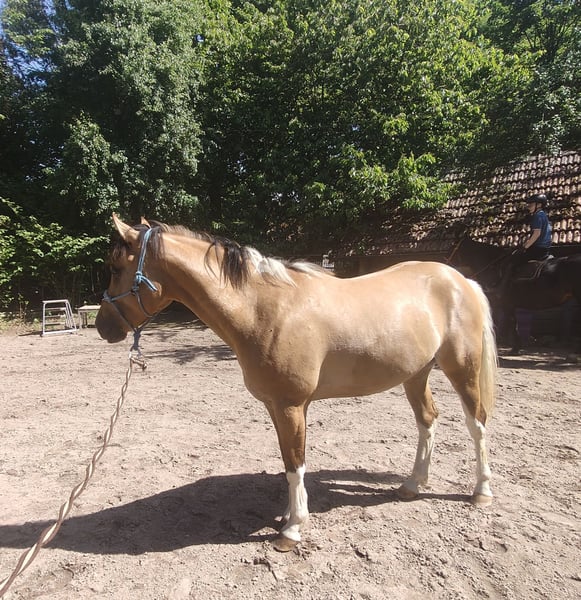 Junge, sehr entspannte Buckskin-Paint-Stute sucht fördernde, liebevolle Hände. Die Kleine kennt Bodenarbeit, kleine Tricks wie Hinlegen, Sattel, gebisslose Zäumung und ist komplett fürs Anreiten vorbereitet. Auf- und Absteigen macht sie schon ganz lieb. Bei Spaziergängen zeigt sie sich neugierig und unerschrocken. Im Umgang lieb und menschenbezogen, kennt Hänger fahren, ist geimpft und regelmäßig bei der Hufpflege. Robust im Herdenverband aufgewachsen. Fala wird mal ein super liebes Reitpferd und später sicher auch mal für Familien, Kinder, Anfänger interessant. Zuerst braucht sie noch einen erfahrenen Reiter/ Trainer. Vater: der wunderschöne Grullo- Hengst EMH Paints PepsHonani. Wir wünschen uns für die kleine Maus fördernde, liebevolle Hände.