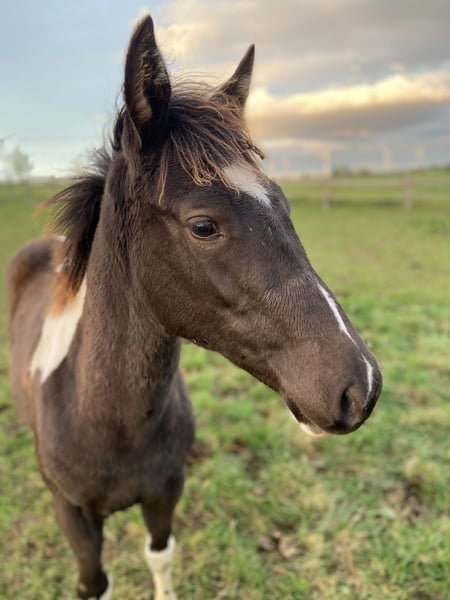 Cavallo Paint mare del 2024, dolce e facile da condurre con il capo.