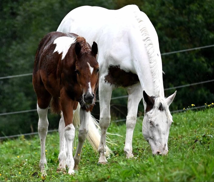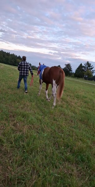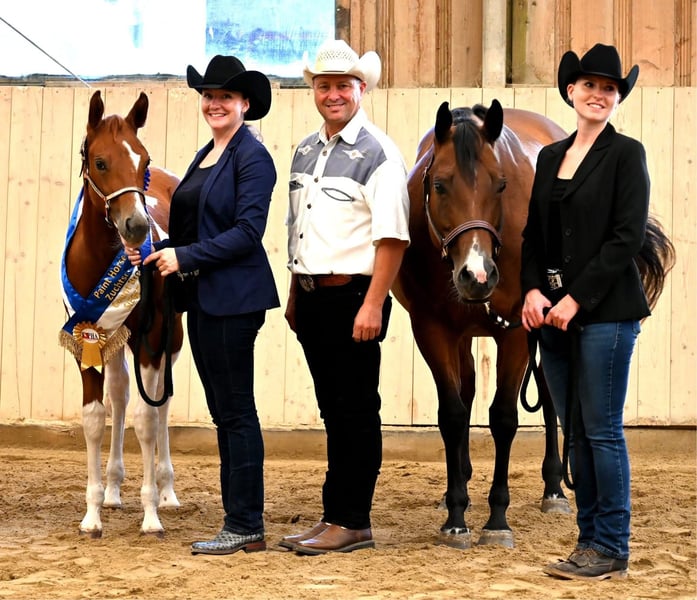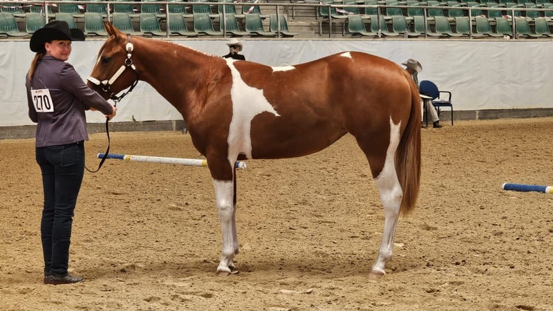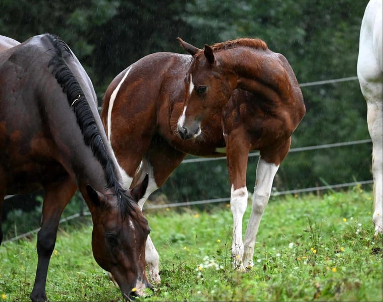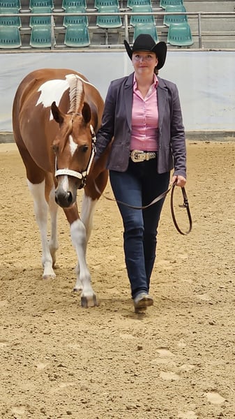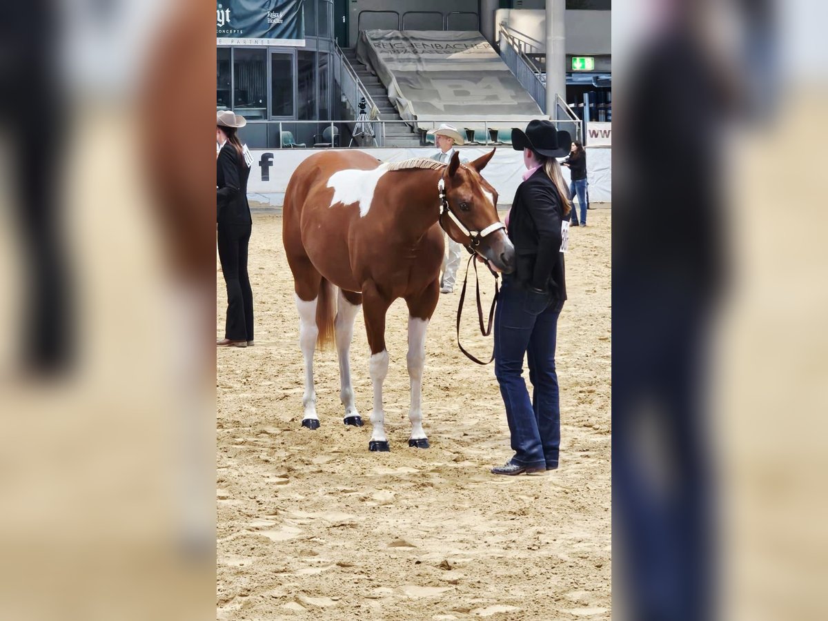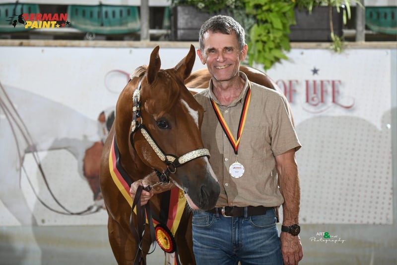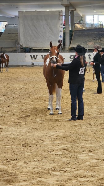 Guaranteed Noworry ist eine am 01.04.2024 geborene Paint Horse Stute in der Farbe Sorrel Tobiano, die mit einem geschätzten Endmaß von ca. 158?160 cm überzeugt. Bereits als Fohlen konnte sie mit einer Wertnote von 83,70 % als Siegerin auf der Fohlenschau begeistern und unterstreicht damit ihre außergewöhnliche Qualität. Sie präsentiert sich als bildhübsche, typvolle junge Stute mit viel Präsenz und Ausdruck. Ihr Gebäude ist korrekt und harmonisch, sie steht auf einem stabilen Fundament mit sehr guten Gelenken und zeigt sich für ihr Alter bereits weit entwickelt und gut bemuskelt. Sie ist gesund und 6-Panel n/n getestet. Charakterlich überzeugt Noworry durch ihre menschenbezogene, liebe und zugleich sehr selbstbewusste Art. Sie ist neugierig, sensibel und fein in der Kommunikation, dabei lernwillig und intelligent. In neuen Situationen verhält sie sich souverän und gelassen, ist gut sozialisiert und problemlos in die Herde integrierbar. Altersbedingt zeigt sie sich gelegentlich keck und ein wenig frech, bleibt dabei jedoch stets händelbar und eignet sich für erfahrene Pferdemenschen, die Freude an der weiteren Förderung eines jungen Pferdes haben. In ihrer bisherigen Ausbildung kennt sie das Fohlen-ABC, ist halfterführig und hat bereits erste Erfahrungen im Showbereich gesammelt. Zudem ist sie mit Bodenarbeit vertraut und beherrscht die Grundlagen in Schritt und Trab an der Longe. Ihre bisherigen Erfolge sprechen für sich: Neben dem Titel der Fohlenschausiegerin 2024 konnte sie sich als Futurity Champion PHCG 2025 sowie als Deutscher Meister in der Yearling Halter Klasse (German Paint 2025) behaupten. Abstammungsbedingt (Guaranteed Invitation x Lazy Loper) bringt sie beste Voraussetzungen für eine Karriere im Pleasure- oder Allroundbereich mit und überzeugt durch überdurchschnittliche Gangarten sowie ihre besondere Ausstrahlung, mit der sie überall auffällt. Sie kennt sowohl Offenstallhaltung als auch die Unterbringung in einer Paddockbox, genießt täglichen Weidegang bei jedem Wetter und ist im Umgang mit Tierarzt und Hufschmied absolut unkompliziert. Selbstverständlich wird sie regelmäßig geimpft und entwurmt. Die Abgabe erfolgt mit vollständigen APHA-Papieren sowie Equidenpass. Gesucht wird ein förderndes, erfahrenes Zuhause mit Herz und Pferdeverstand, das dieses besondere Nachwuchspferd weiter ausbildet und ihr großes Potenzial erkennt und nutzt. Guaranteed Noworry ist ein wundervolles, auffallend schönes Pferd, das ihrem zukünftigen Besitzer viel Freude bereiten wird und sowohl im Sport als auch in der Freizeit eine vielversprechende Zukunft vor sich hat.