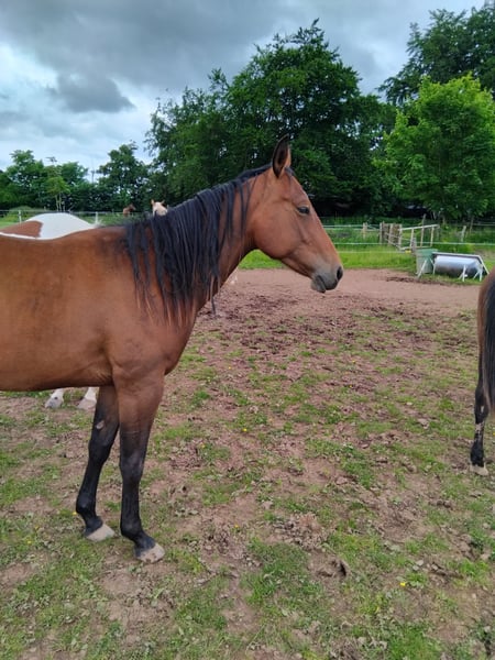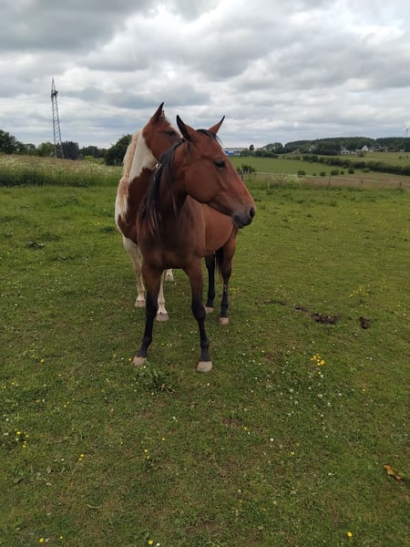 Dear beautiful chocolate-colored mare, untrained. Raised in a small group, well-behaved in handling. In perfect health, regularly dewormed. We have been hobby breeders for 30 years and have sold healthy foals. Father is a Quarter Horse, mother is a black and white Paint. HOLLY IS WITHOUT papers. (It would be more expensive with papers.) VIEWING by appointment, phone 01728860231 or 06557900092. Thank you. Only in absolutely loving hands, our Quarter Horse stallion is 12 years old, untrained, but gentle in handling. He looks exactly like Holly. For sale. In perfect health. Price by arrangement!!