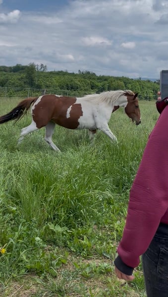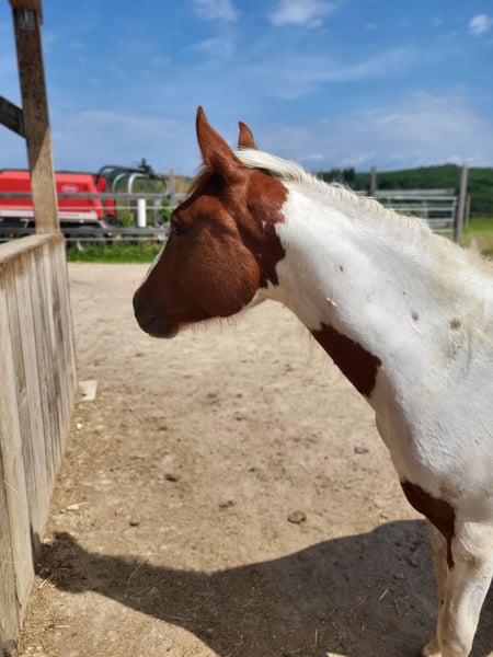 We are looking for a 5 star home for our "Phoebe". The sweet Paint mare (born 2023) saw the light of day with us. Her parents are also on our farm: Dam: Indiana Sire: Zippos King Bar Her full sister from 2024 can also be viewed at our farm. Phoebe has everything you could wish for: Strong, correct conformation, absolutely fearless, very fond of people and always open to new things. She has learned everything you need to know at this age: Giving hooves, introducing her to the farrier, grooming, showering/washing, walking/leading. Phoebe has all her basic vaccinations and is wormed regularly. She has an equine passport. She is currently being reared with other young horses. She can either stay here for further rearing or move to her new home. If you would like to get to know Phoebe, simply write to us.
