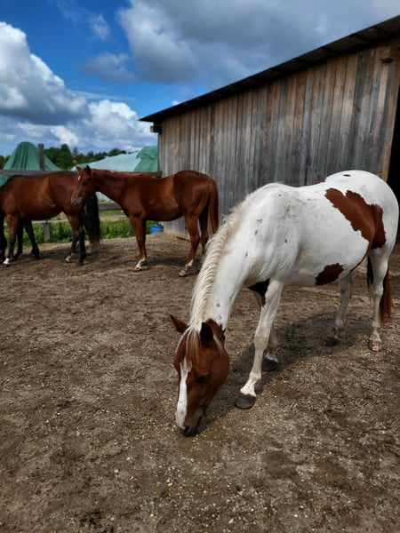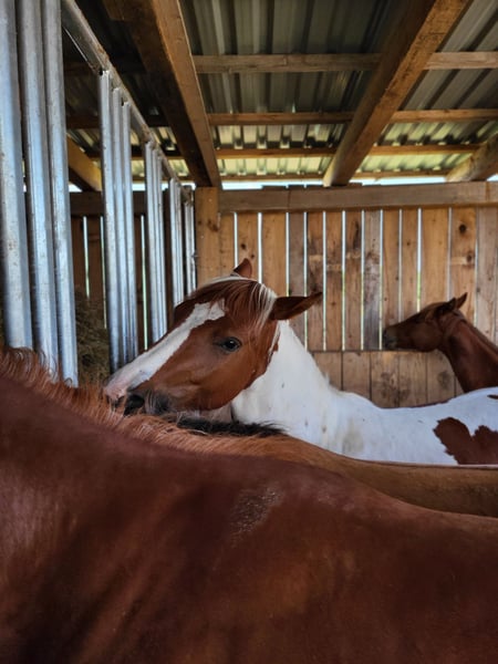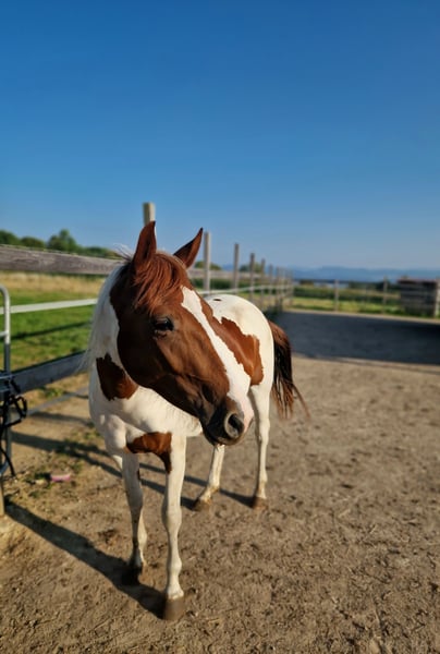 Per la nostra "Phoebe" cerchiamo una casa a 5 stelle. La dolce puledra Paint (nata nel 2023) ha visto la luce del mondo da noi. I suoi genitori sono anch'essi nella nostra scuderia: Madre: Indiana Padre: Zippos King Bar La sua sorella piena del 2024 può essere visionata da noi. Phoebe ha tutto ciò che si desidera: Struttura robusta e corretta, assolutamente impavida, molto affettuosa nei confronti delle persone e sempre aperta a nuove esperienze. Ha conosciuto tutto ciò che si deve sapere a quest'età: Dare i piedi, presentarsi dal maniscalco, essere spazzolata, fare la doccia/lavarsi, passeggiare/essere condotta. Phoebe ha tutte le vaccinazioni di base e viene sverminata regolarmente da noi. Possiede un passaporto equino. Attualmente si trova con altri puledri giovani da noi in allevamento. Può rimanere qui per un ulteriore allevamento o trasferirsi nella sua nuova casa. Se desiderate conoscere Phoebe, non esitate a contattarci.